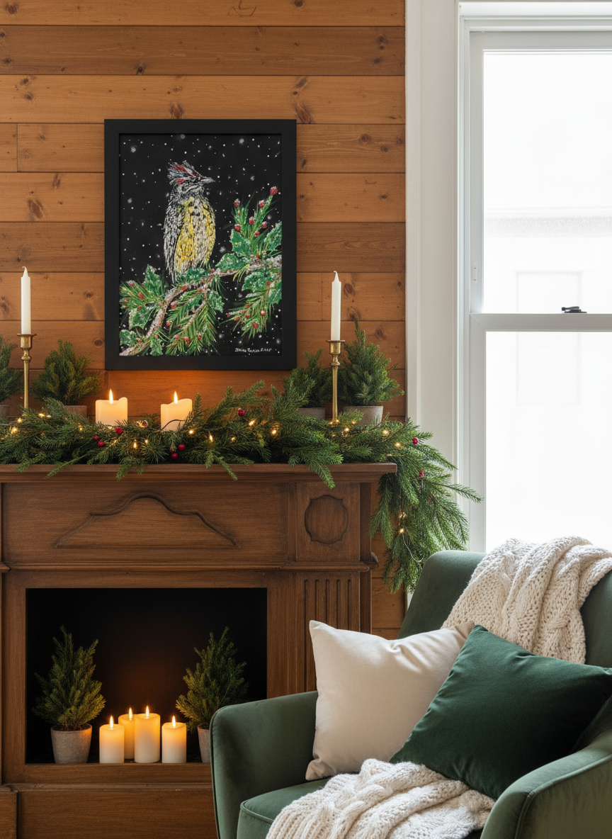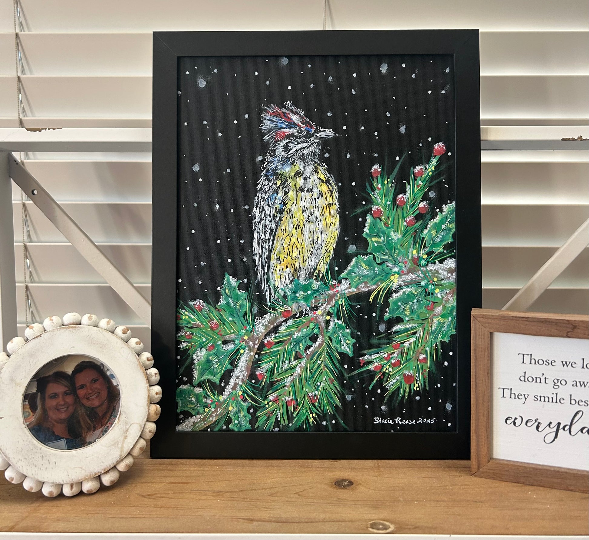 A quiet snowfall. A single bird, perched with purpose among crimson berries and frost-laced branches. A song beneath snowfall captures the hush of winter and the warmth of memory, painted in rich acrylics on black canvas board to evoke depth and contrast. With its golden chest and feathered crest, the bird stands as a symbol of resilience and presence—an echo of those we hold dear, even in stillness.