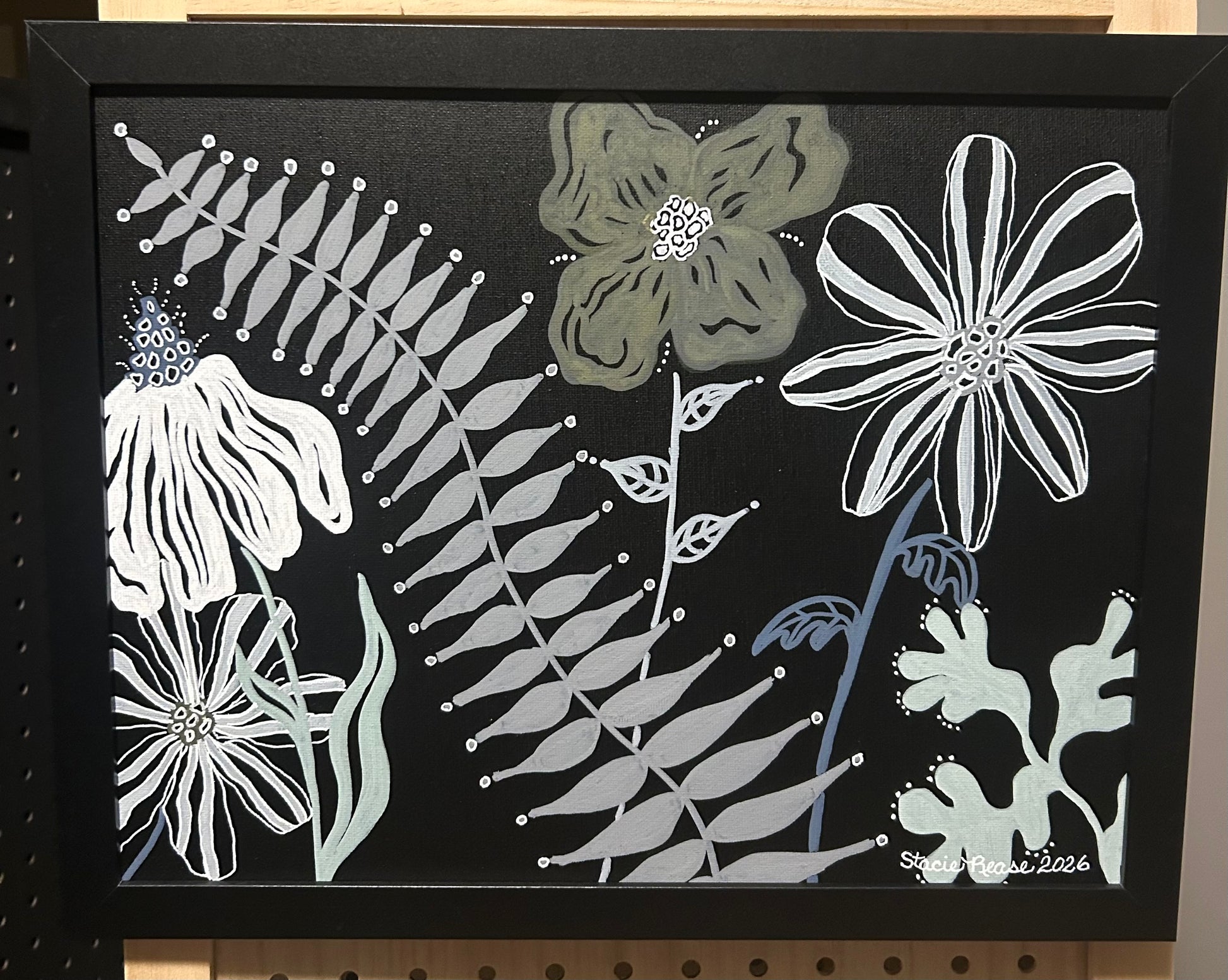 This 11 x 14 original acrylic painting brings a refined, modern twist to botanical art. Set against a deep black canvas board, the hand‑drawn florals and foliage emerge in soft, muted tones, creating a striking contrast that feels both contemporary and timeless. Each line is intentionally placed, forming an abstract botanical composition that invites the viewer to slow down and explore its quiet details.