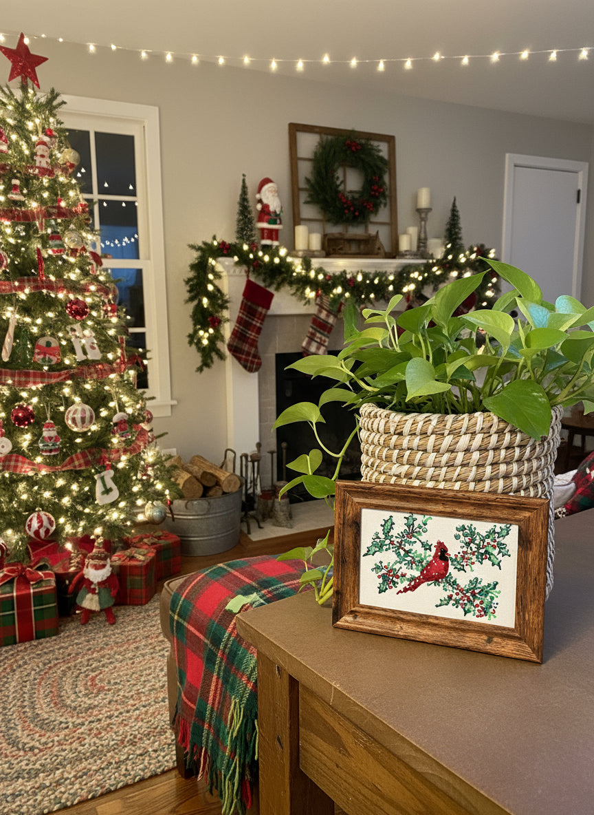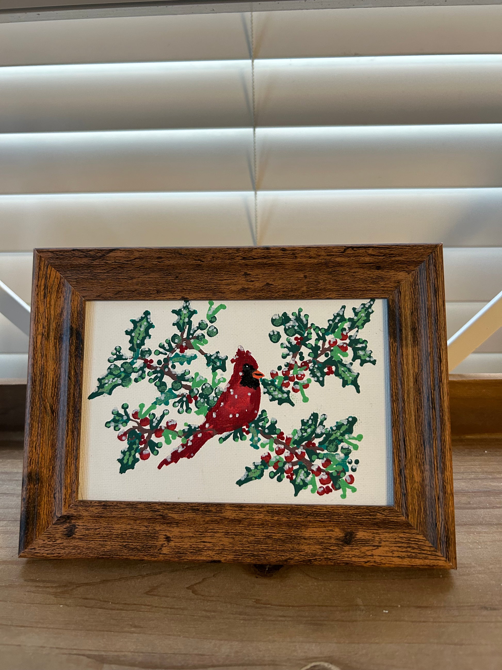 A tender tribute to nature’s quiet chorus, this trio captures the charm of three beloved birds nestled among winter berries and evergreen leaves.