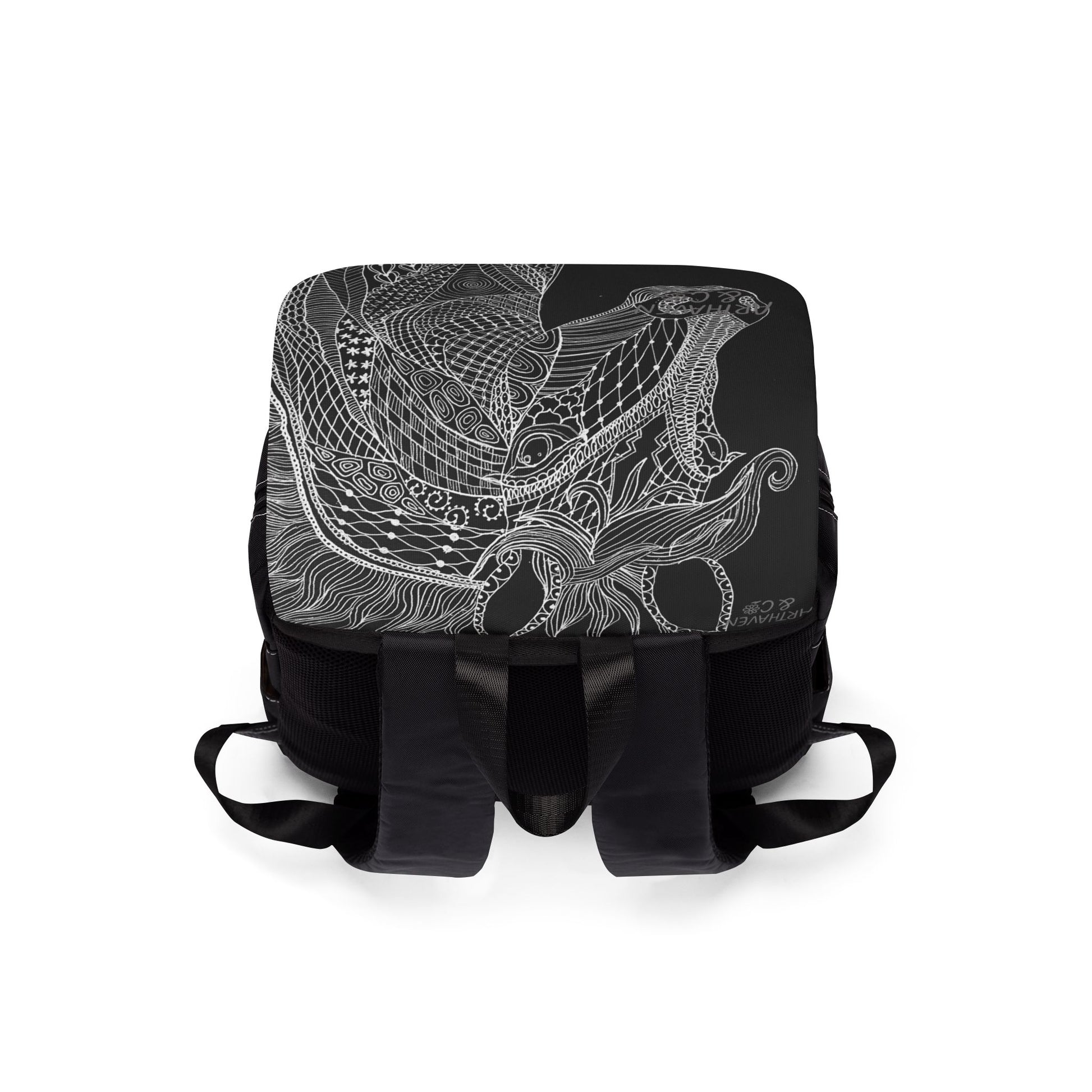 This compact shoulder backpack brings quiet sophistication to everyday carry. Built from durable 100% Oxford canvas with a deep black interior and base, it wears in while keeping a refined silhouette. The top flap features an artful monochrome pattern that hints at hand-drawn texture—subtle enough for daily commuting, striking enough to anchor a travel outfit. Six thoughtfully arranged compartments keep a laptop, water bottle, chargers, and small essentials separated and easy to reach. Padded mesh back and adjustable straps make longer walks comfortable, while buckle straps on the flap add security and a classic field-bag feel. It moves easily from city streets to weekend escapes, blending function and understated style.