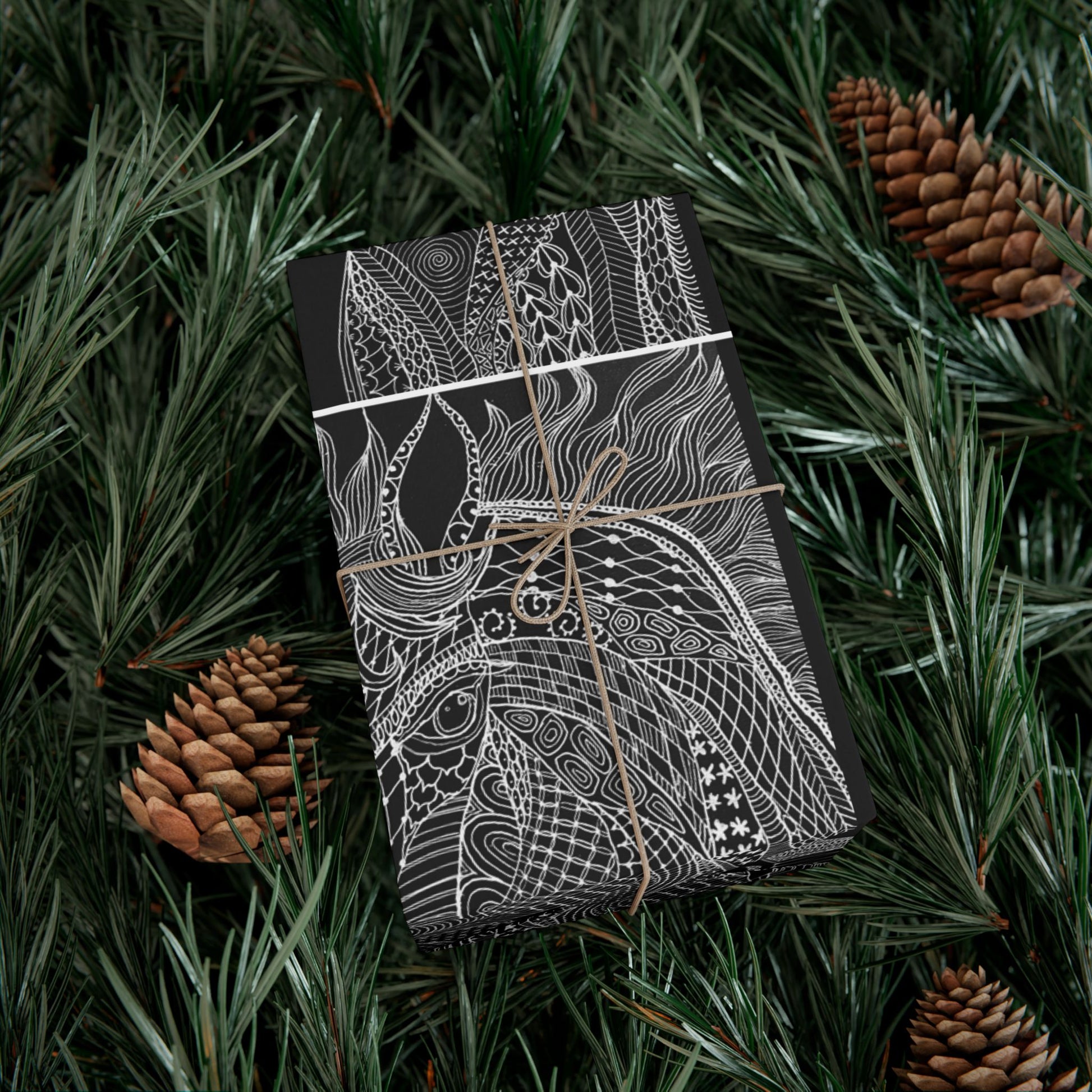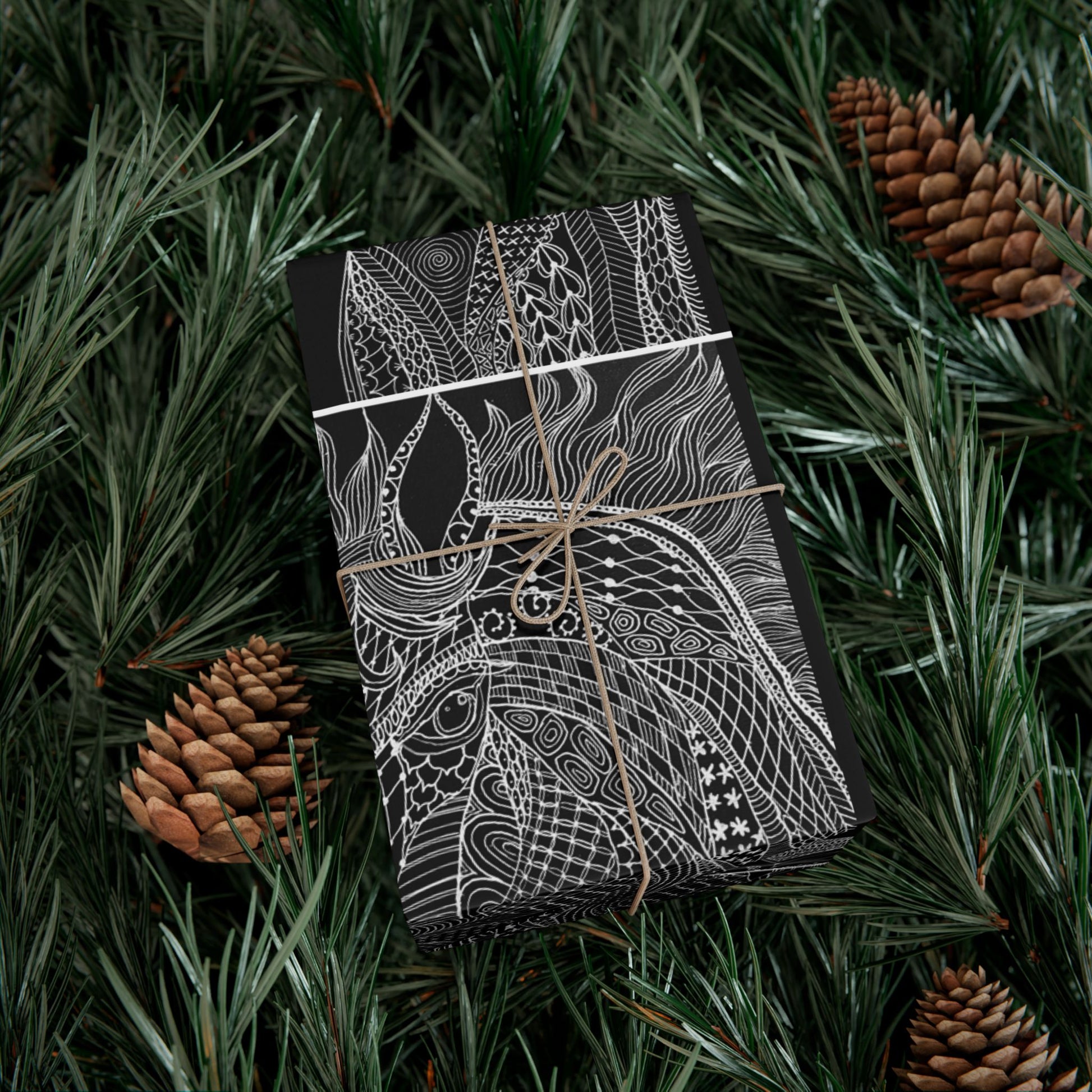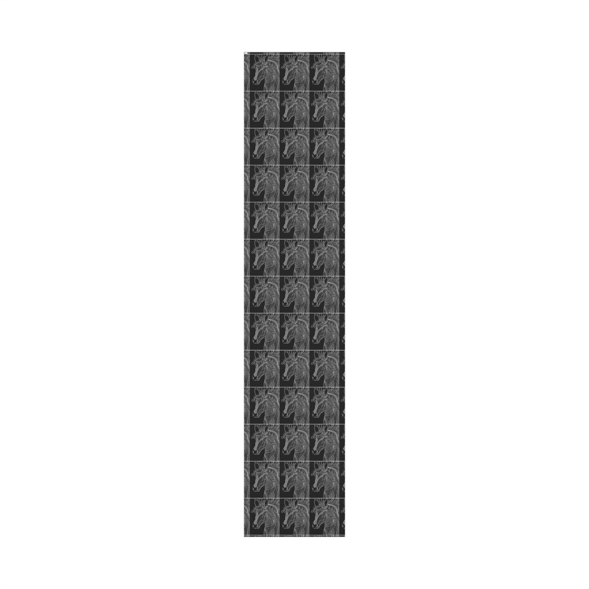 A deep charcoal wrap patterned with hand-drawn horse. The high-contrast monochrome makes any present feel considered and modern—sophisticated without shouting. The paper lays smooth across corners and keeps crisp folds, so ribbons, twine, or stamped tags sit cleanly on top. Picture exchanging thoughtful, pared-back gifts at a quiet gathering, or wrapping a small treasure for someone who loves muted, artful details. This wrap reads like a quiet statement: careful, crafted, and quietly stylish.