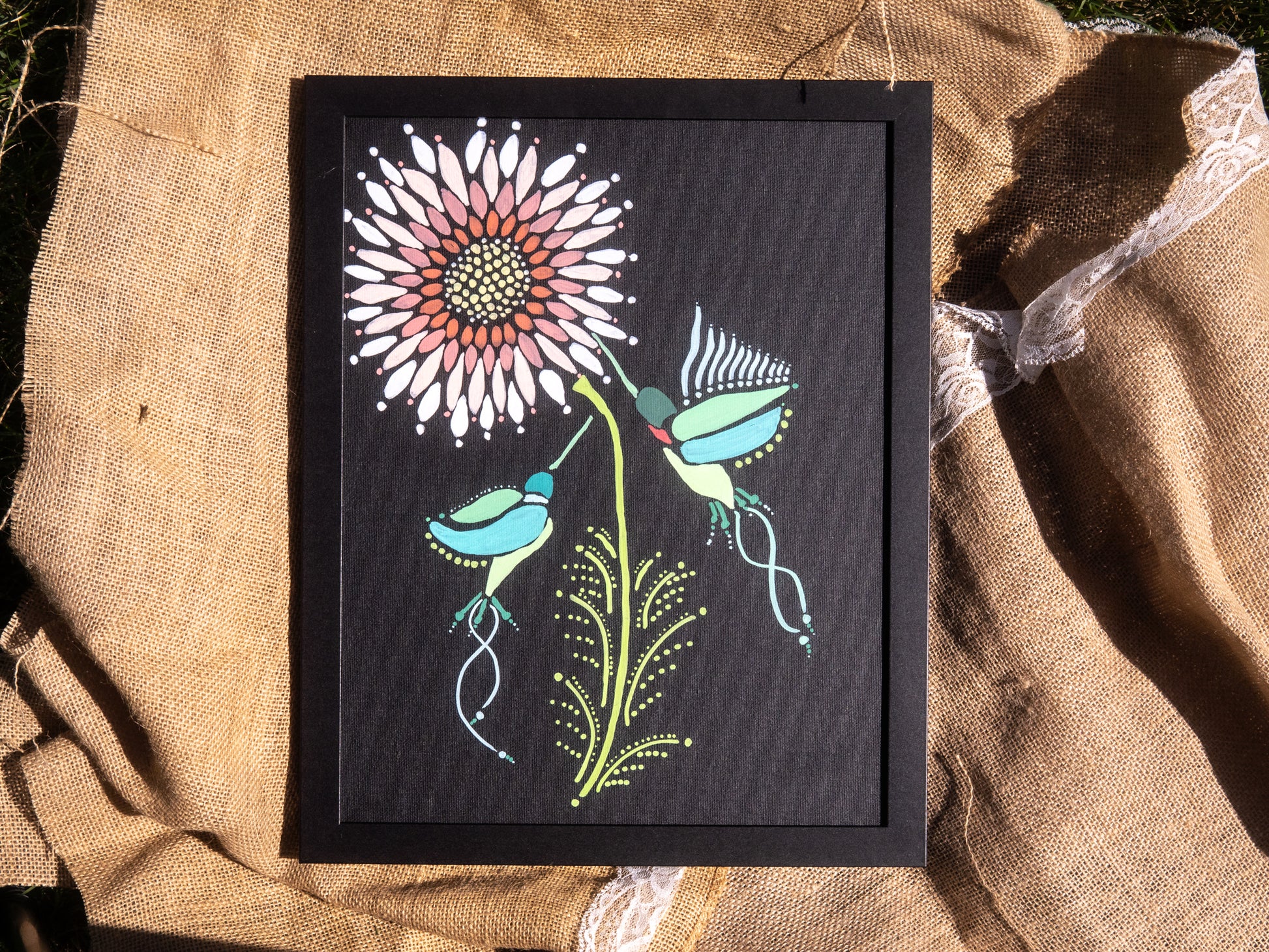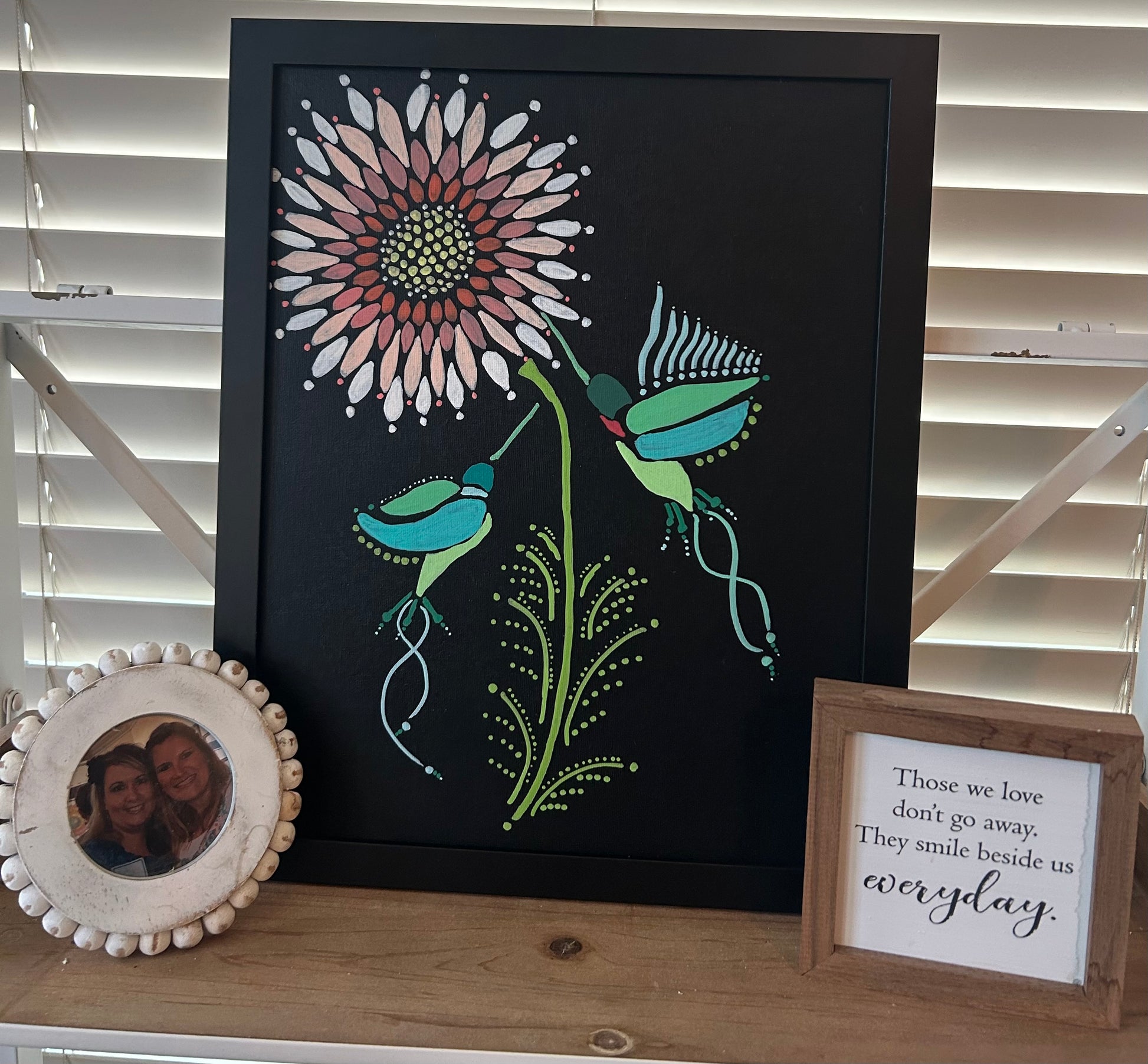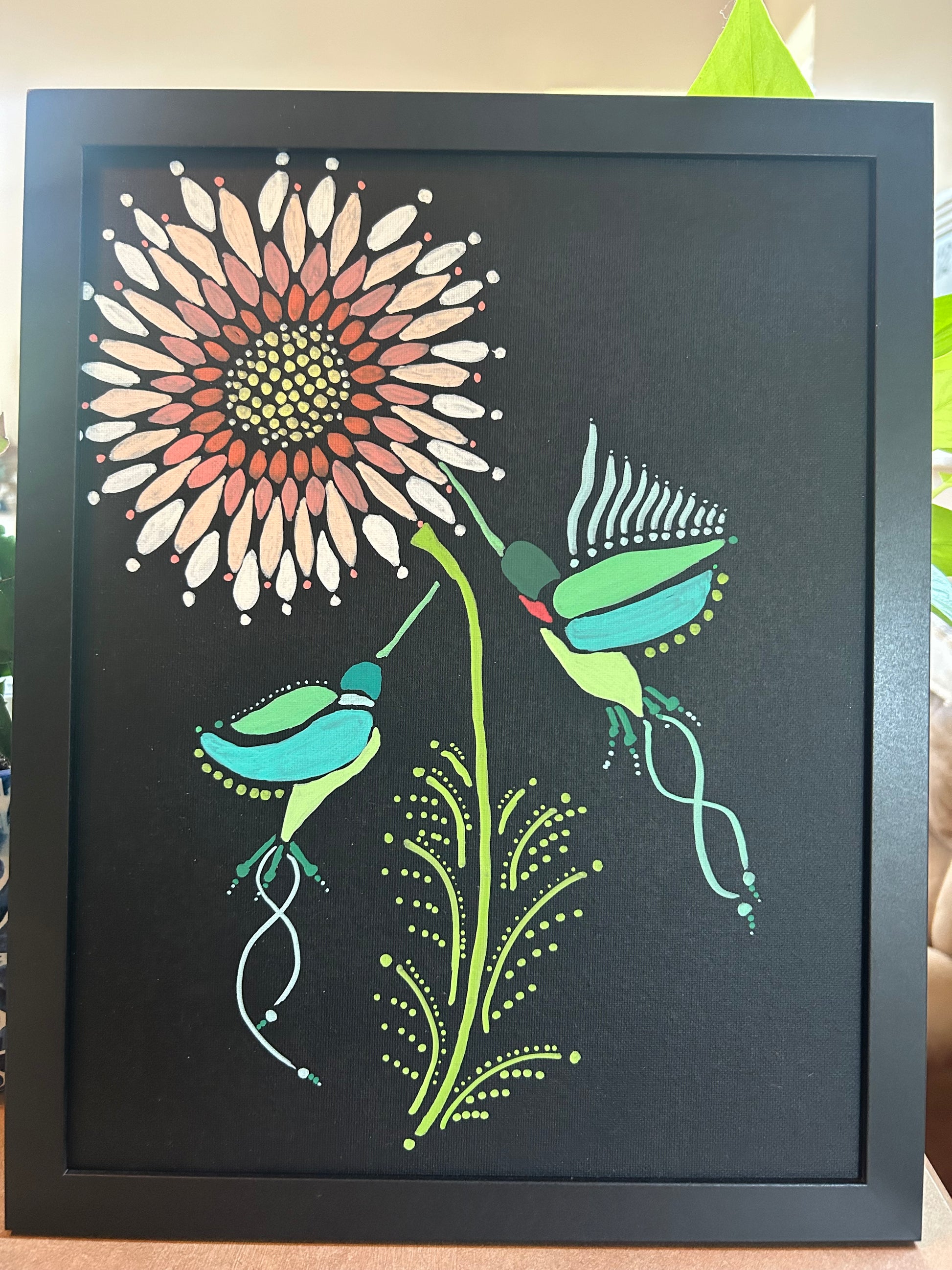 This one-of-a-kind 11x14 acrylic painting on stretched black canvas is a celebration of motion, mystery, and joy. A stylized bloom unfolds in radiant color while two whimsical hummingbirds flutter nearby, trailing dotted paths and swirling stems like poetry in flight. Hand-painted with heart by Art Haven & Co., this framed piece invites warmth, wonder, and a touch of magic into your space.