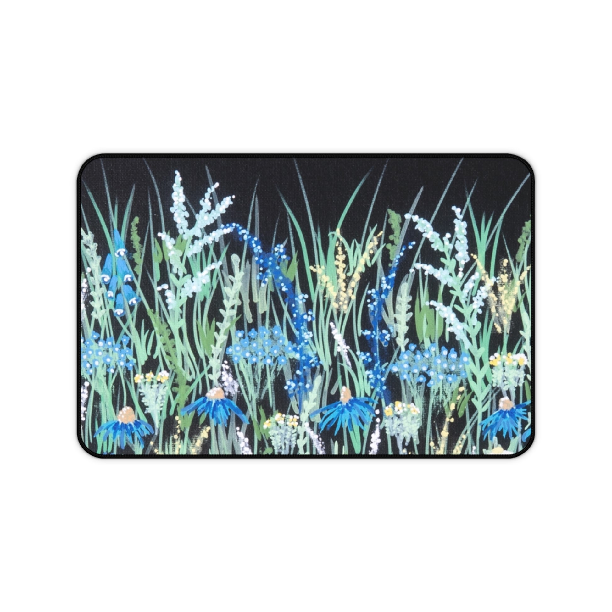 Settle into a calm, focused workspace with this watercolor meadow desk mat. Soft blues and pale greens drift across a deep background, like moonlit wildflowers pressing against your keyboard. The smooth neoprene surface gives pens, mice, and wrists an effortless glide while the stitched edges and durable print keep the artwork vivid through daily use. It turns a cluttered desk into a small, soothing scene — a quiet corner for writing notes, sketching ideas, or settling into a long work session.