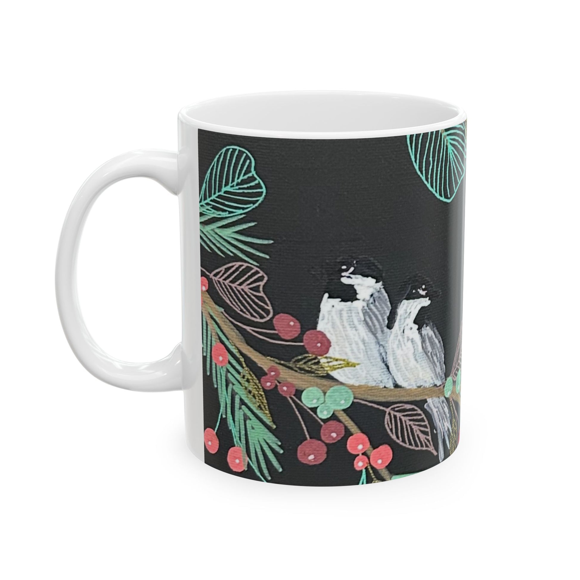 Botanical Bird Ceramic Mug — Black Floral Sparrow Coffee Cup (11oz & 15oz)