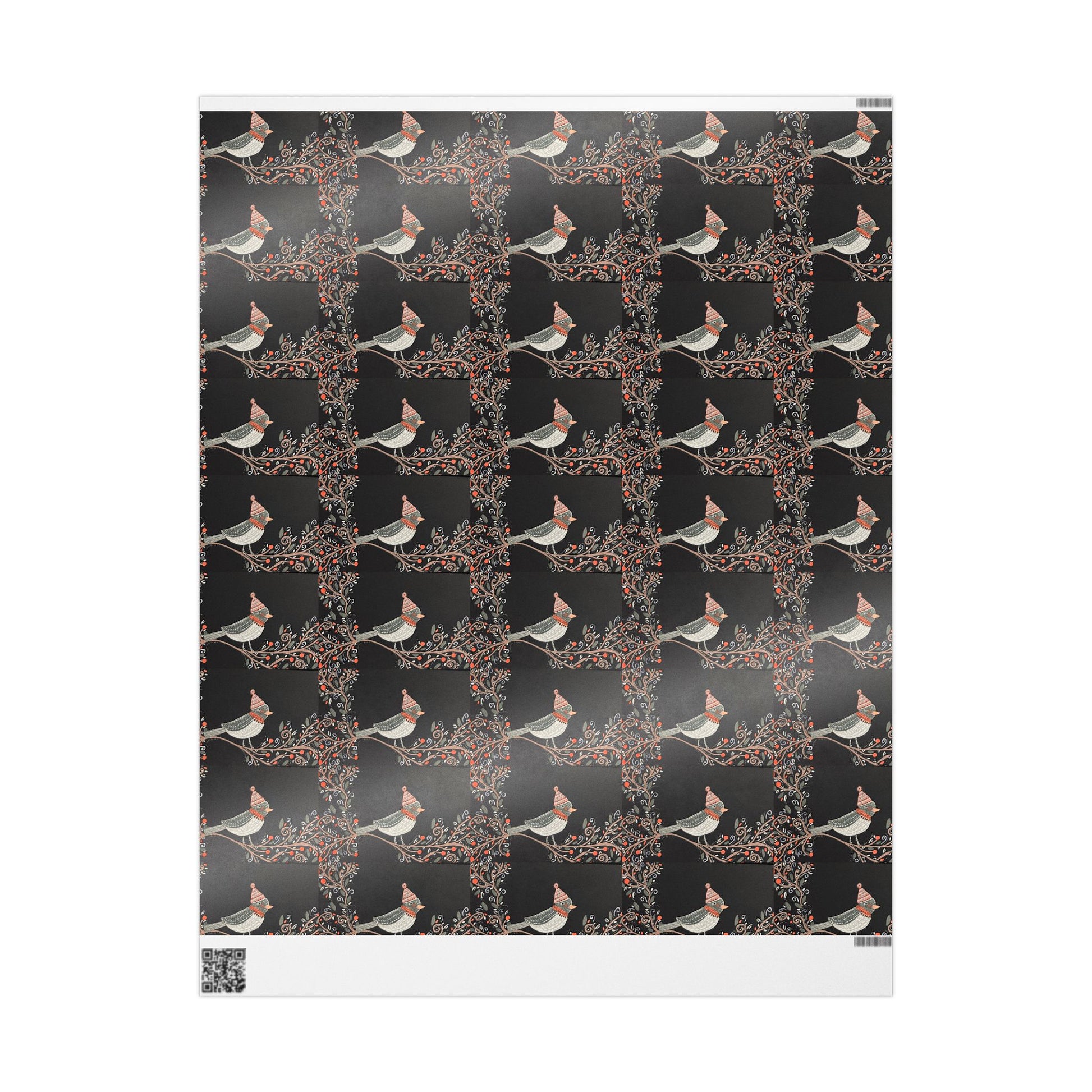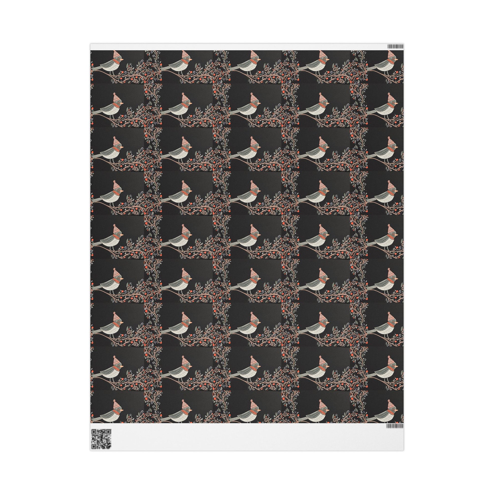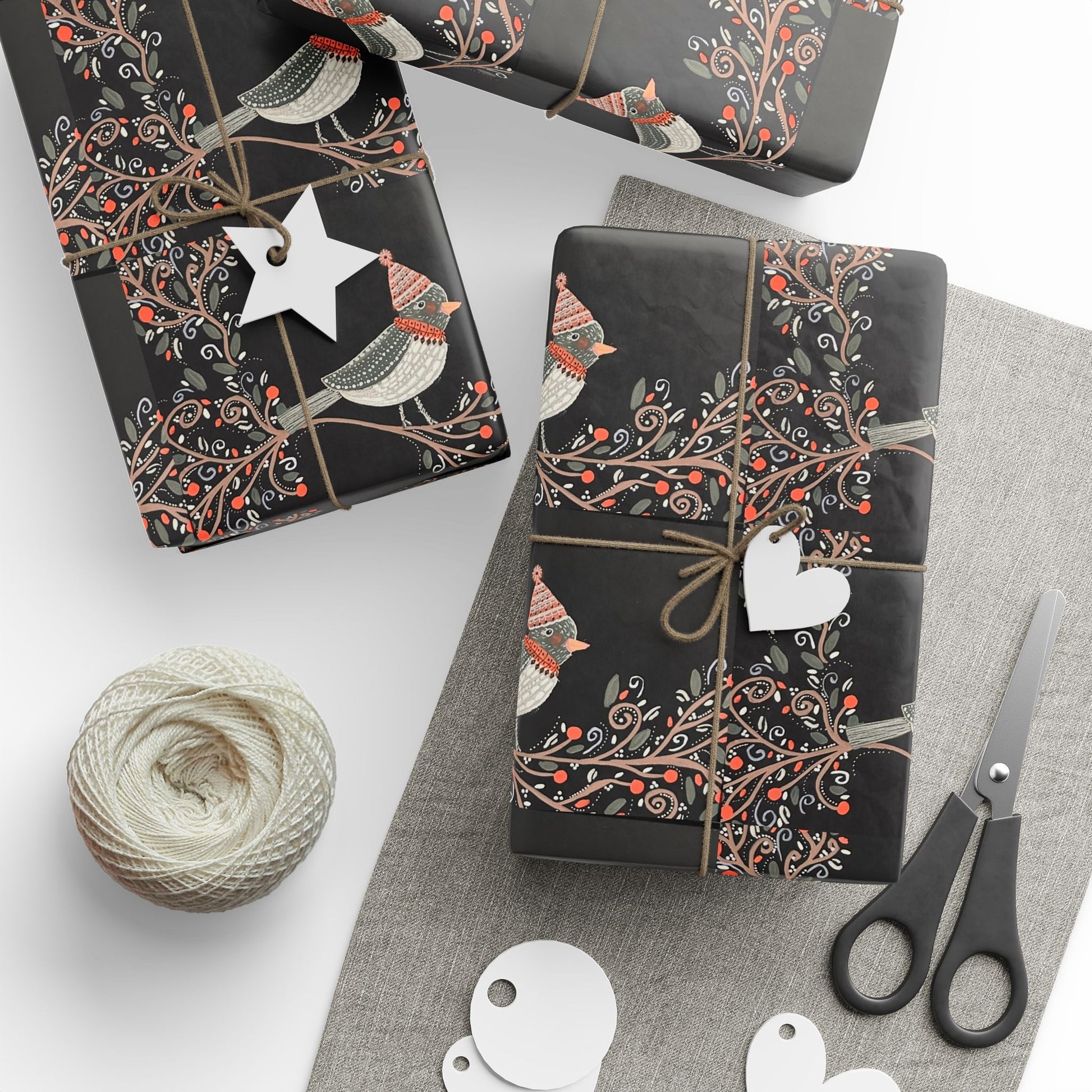 Deep charcoal wrapping paper patterned with hand-drawn songbirds perched among winding, whimsical branches. The repeat design feels both vintage and modern — quiet, slightly mysterious, and lightly festive. Each sheet wraps a present in moody elegance: muted terracotta and cream accents stand out against the dark background, giving parcels a refined, artistic look. Use it when you want a wrapped gift to arrive like a little story — thoughtful, considered, and quietly delightful.