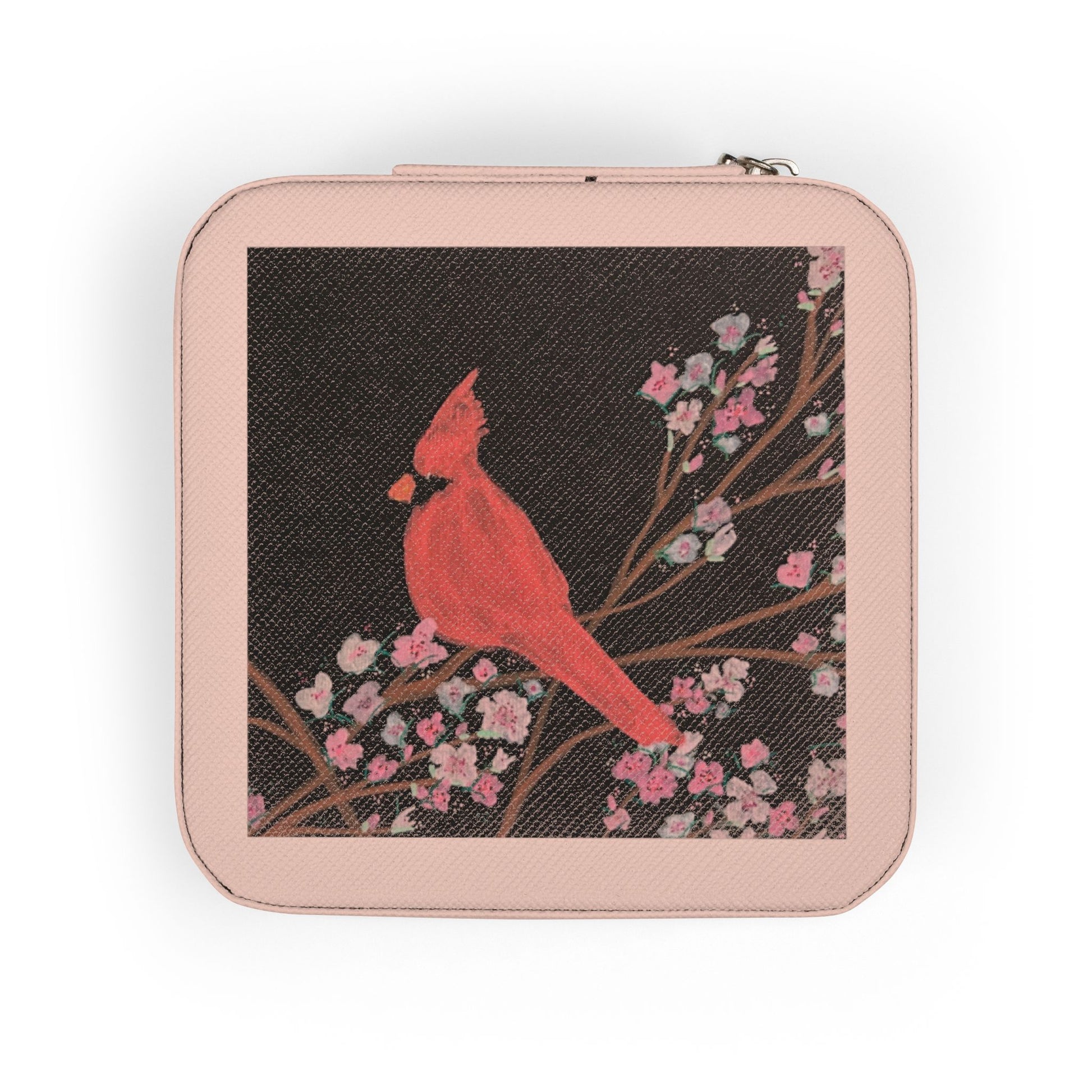 A petite, travel-ready jewelry case that keeps treasured pieces safe and organized wherever you go. Soft blush PU leather exterior and plush fabric lining cradle rings, studs, necklaces and bracelets in four divided compartments, snug ring rolls and three hanging hooks. The square zip-around design closes securely to prevent tangles and scratches, while the compact 4" x 4" x 2" size slips easily into a purse or carry-on. The top panel’s UV-decorated cardinal artwork adds a personal, handcrafted feel — a tiny keepsake box with thoughtful protection for everyday travel and weekend escapes.