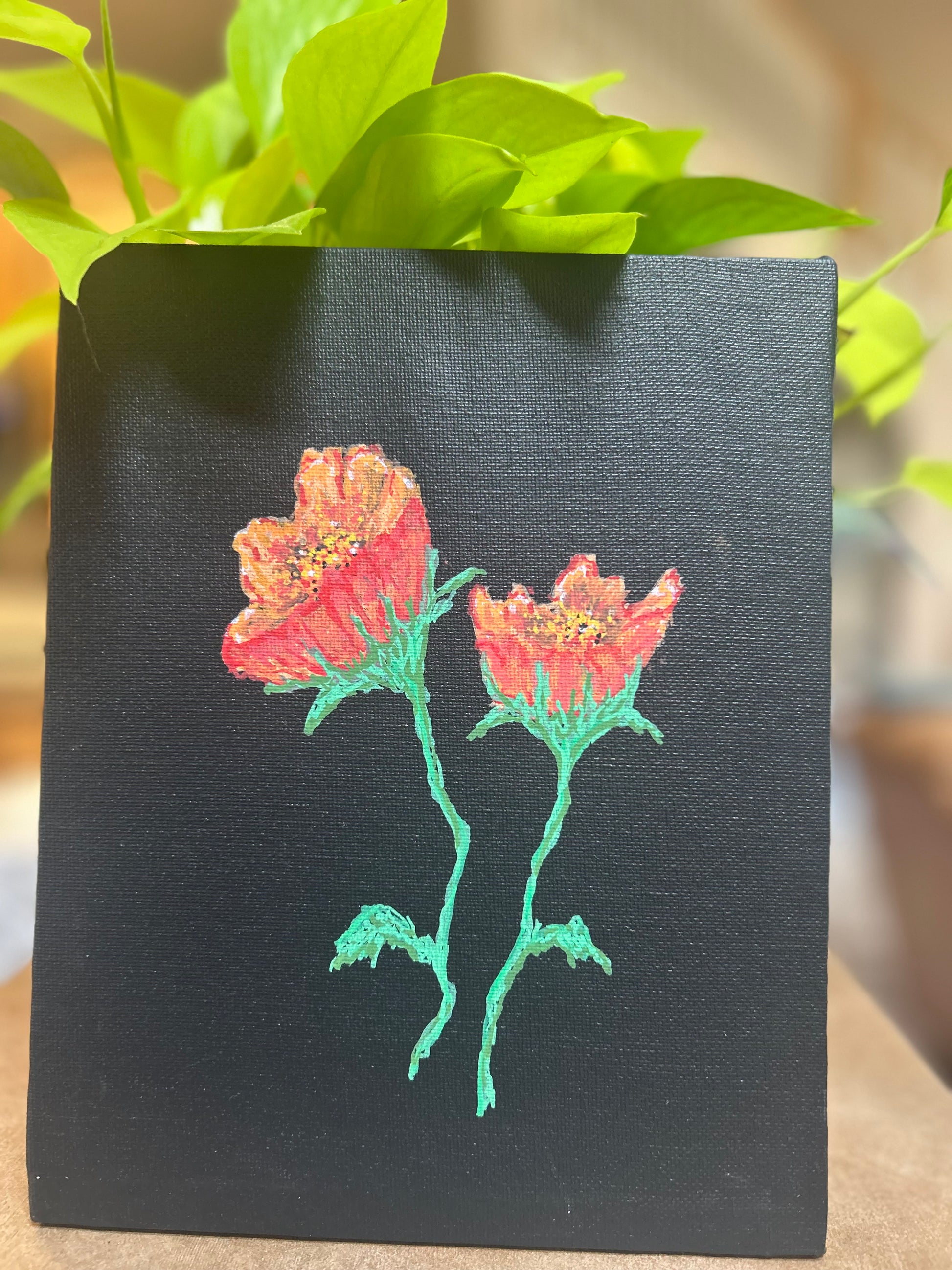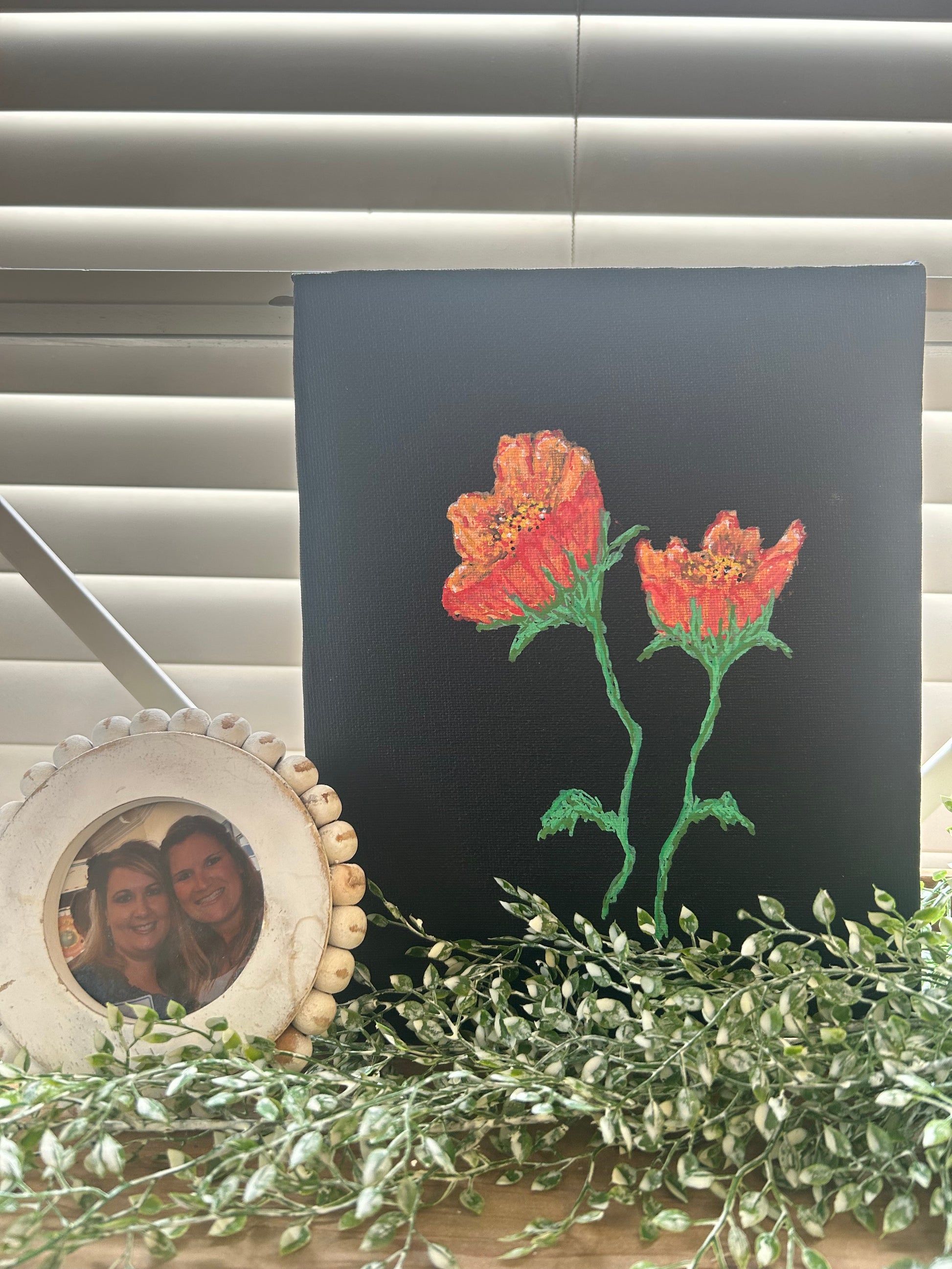 8 x 10 acrylic painting on black stretched canvas. A Vibrant red-orange floral painting with textured petals and golden centers on a black background. A bold, hand-painted piece that blends warmth, contrast, and botanical elegance—ideal for modern interiors or meaningful gifts.