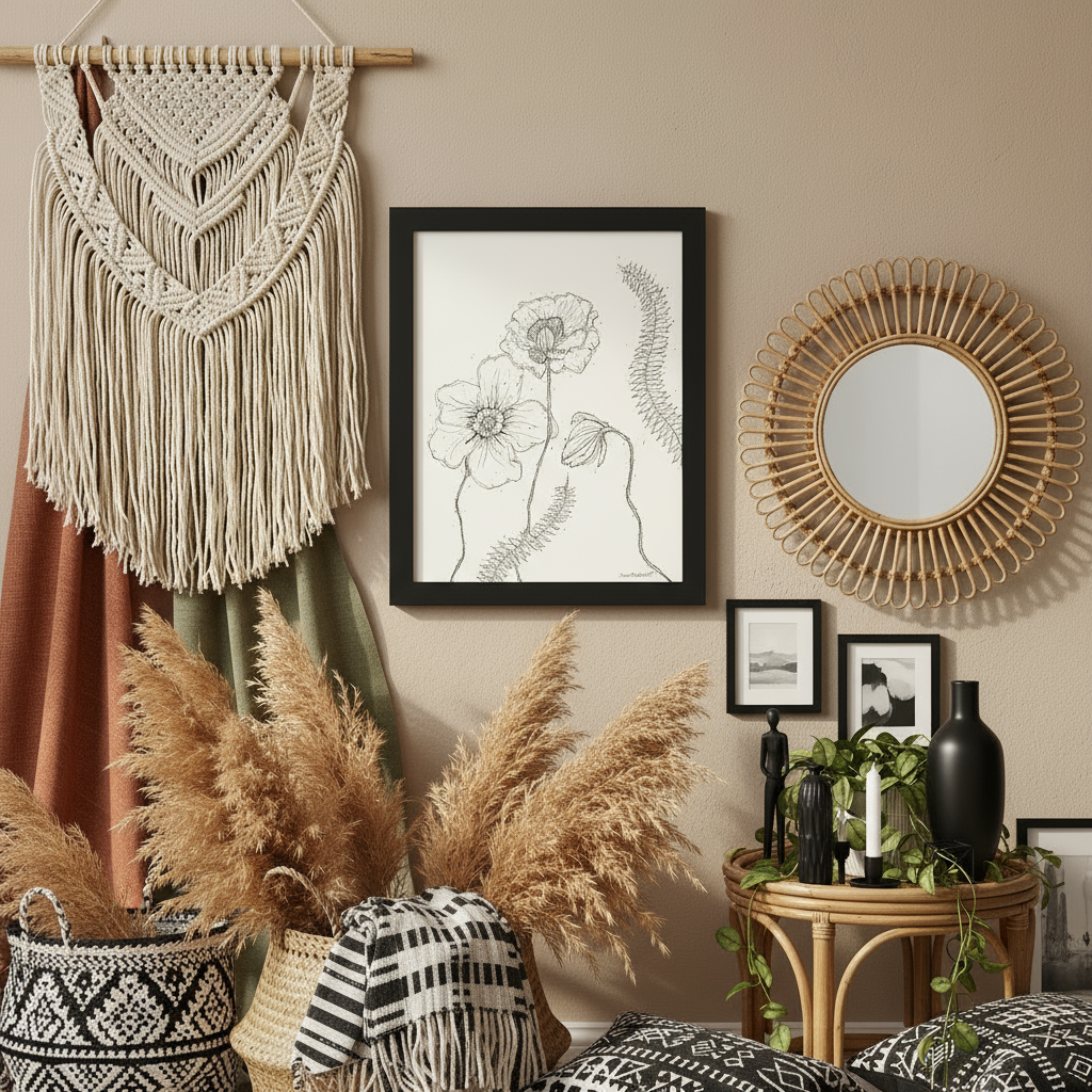 A quiet bloom, a graceful bend—this black-and-white ink drawing captures the tender rhythm of nature. Three expressive poppies rise with soft strength, while two fern-like fronds curve gently, adding balance and flow to the composition. Each line is drawn with care, celebrating the beauty of simplicity and the emotion tucked inside every petal and leaf.
