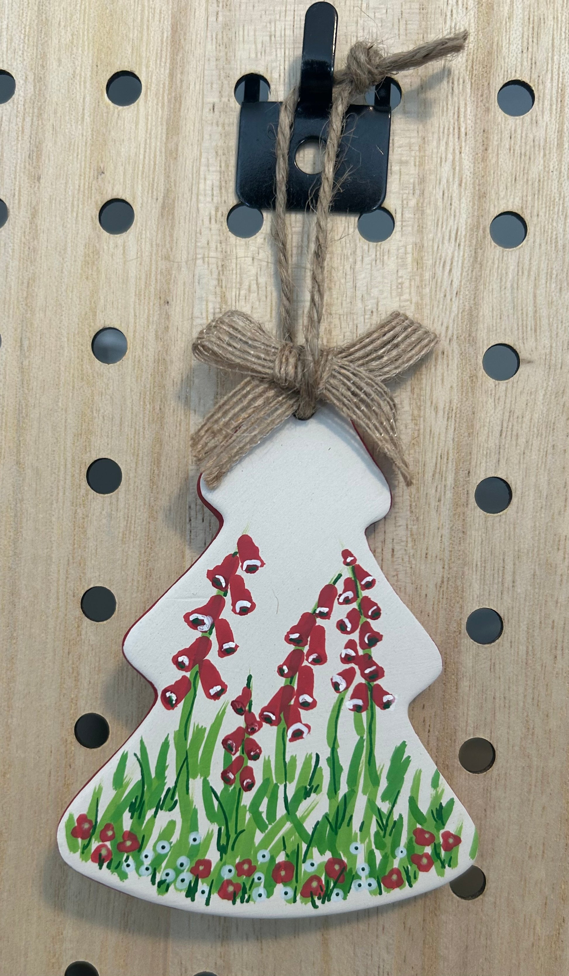 Celebrate the season with a bloom of winter magic. The Fleur Fir ornament is a delicate ceramic keepsake shaped like a Christmas tree and lovingly hand-painted with crimson and ivory florals inspired by foxgloves in winter bloom. Each petal dances across a snowy white backdrop, accented by soft green stems and a rustic twine bow—bringing nature’s quiet elegance to your holiday decor.