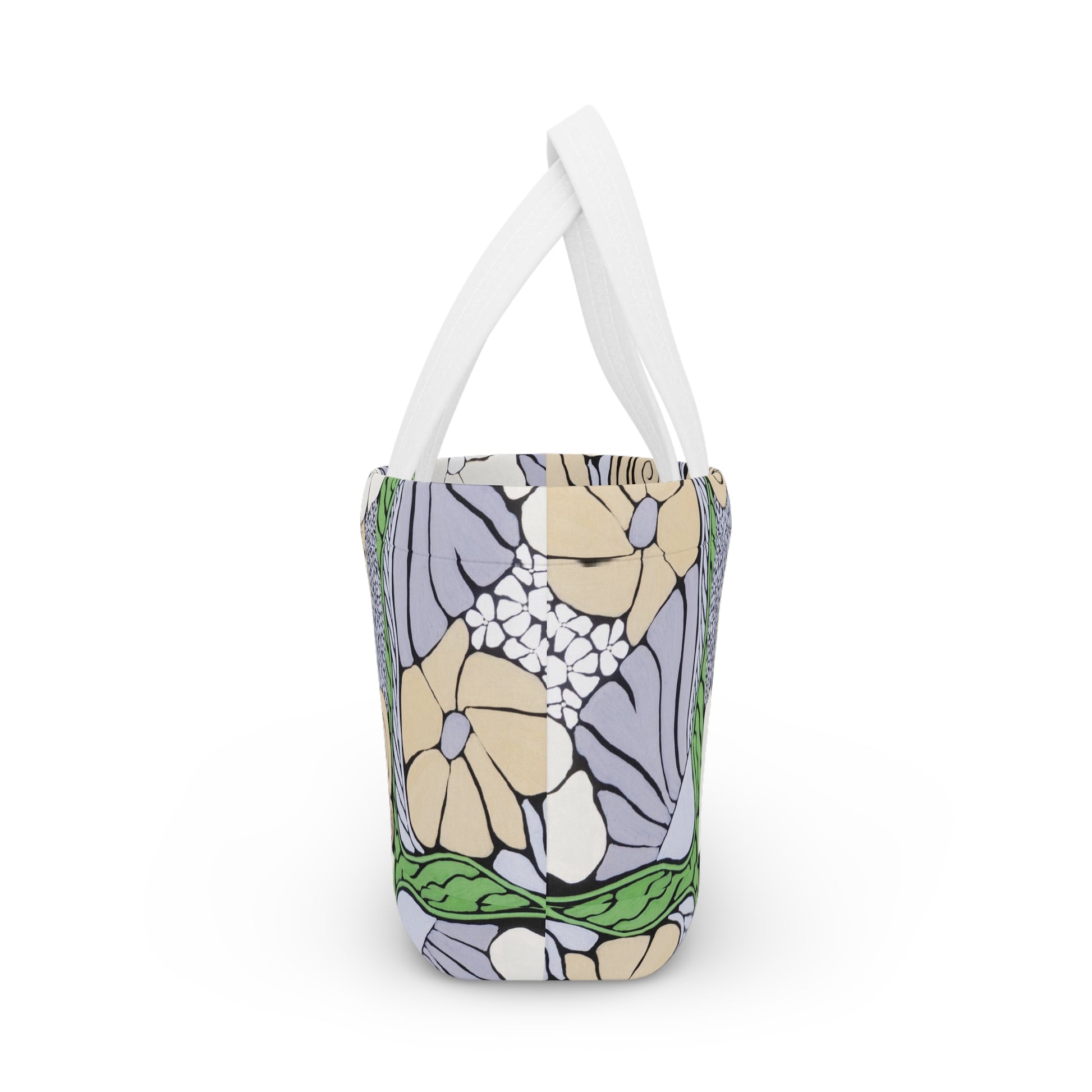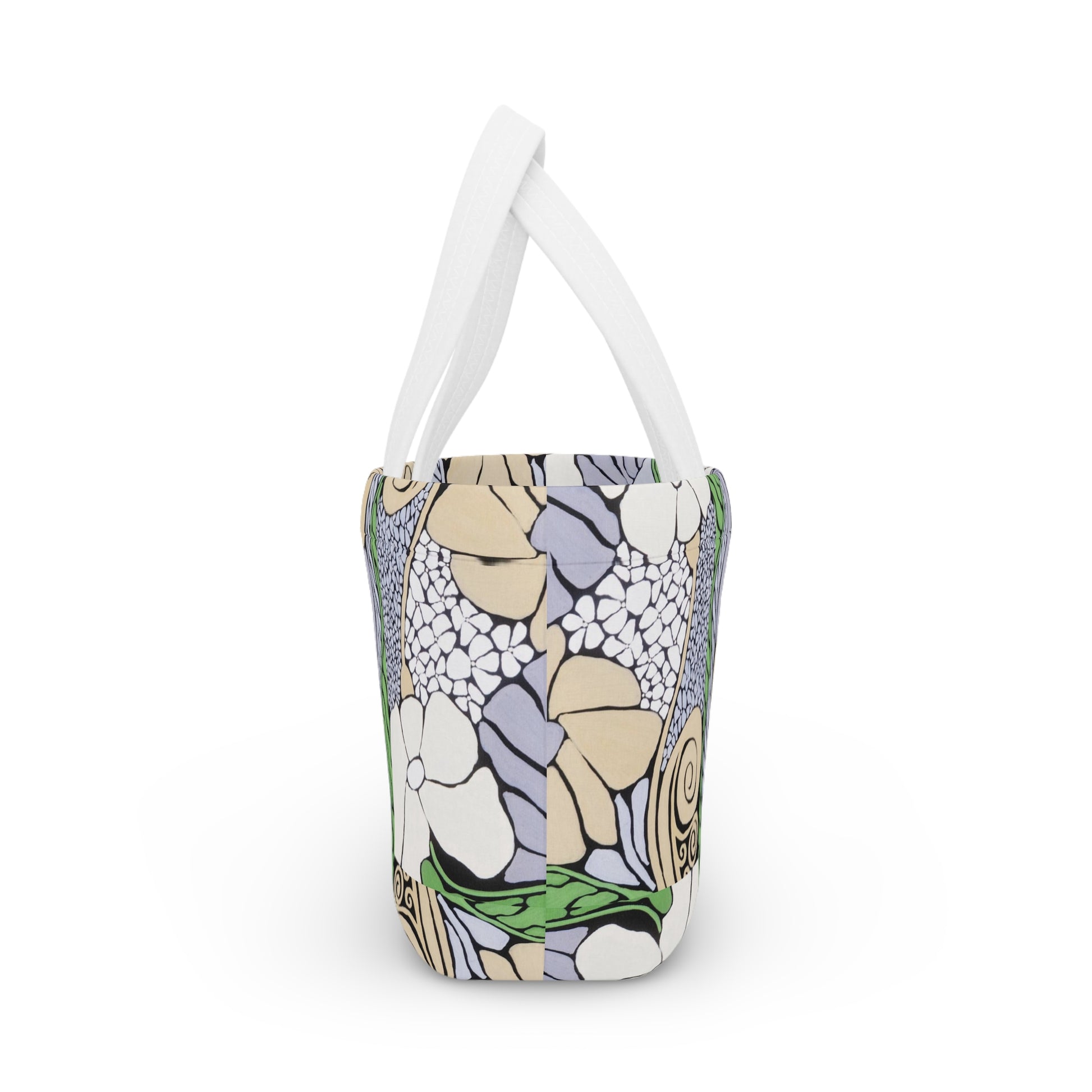A soft neoprene lunch bag that brings artful charm to your midday routine. The curved silhouette and flat bottom hold containers and snacks without tipping. A magnetic button keeps everything tucked in, while the double-bar carrying handles sit comfortably in your hand. The surface features a lively floral-art nouveau print in muted lilacs, sandy neutrals and fresh greens — bright, crisp colors that stay true thanks to modern printing techniques. Lightweight and flexible, this lunch bag slides into a tote or sits on a café table ready for a relaxed lunch outdoors or a busy office day.