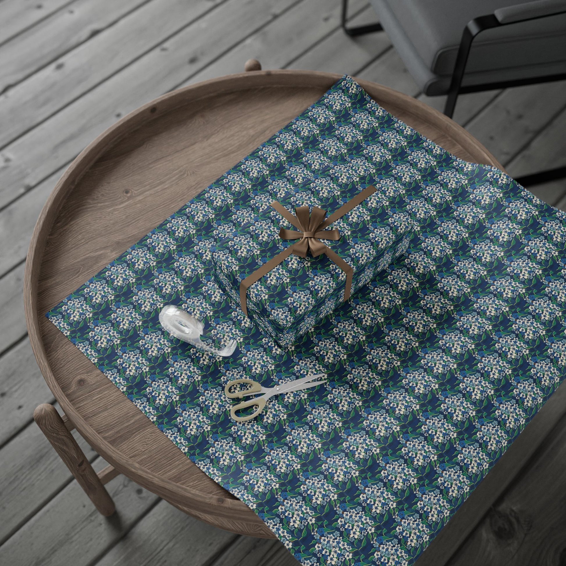 This floral wrapping paper brings a quiet, vintage charm to every present. Tiny white blossoms and leafy vines ripple across a deep blue-green ground, creating a textured, hand-drawn repeat that reads both delicate and restful. It lays smoothly over boxes, rolls neatly around bottles, and adds a thoughtful, artful layer to birthdays, housewarmings, and seasonal exchanges. Choose glossy to make the colors pop or matte for a soft, painterly finish; the thick 90gsm fine art stock holds creases cleanly so bows and knots sit true. The design feels like a found pattern from an old textile shop — familiar, well-loved, and ready to make an everyday gift feel considered.