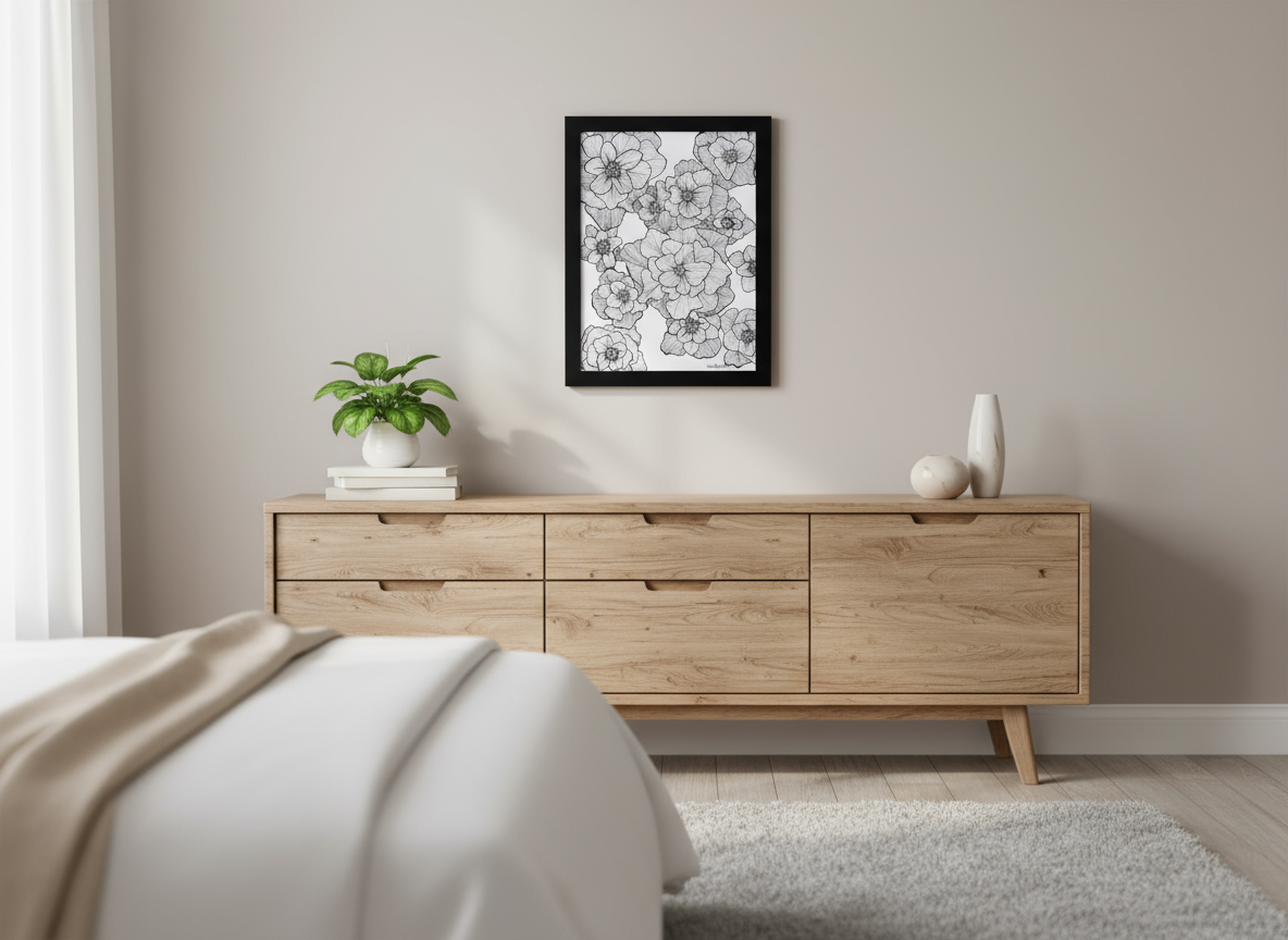 Every petal and curve pulses with life, inviting the viewer to feel the energy behind each mark. Framed in sleek black wood, this piece adds depth and soul to any space—perfect for gallery walls, creative studios, or quiet corners that deserve a touch of expressive elegance.