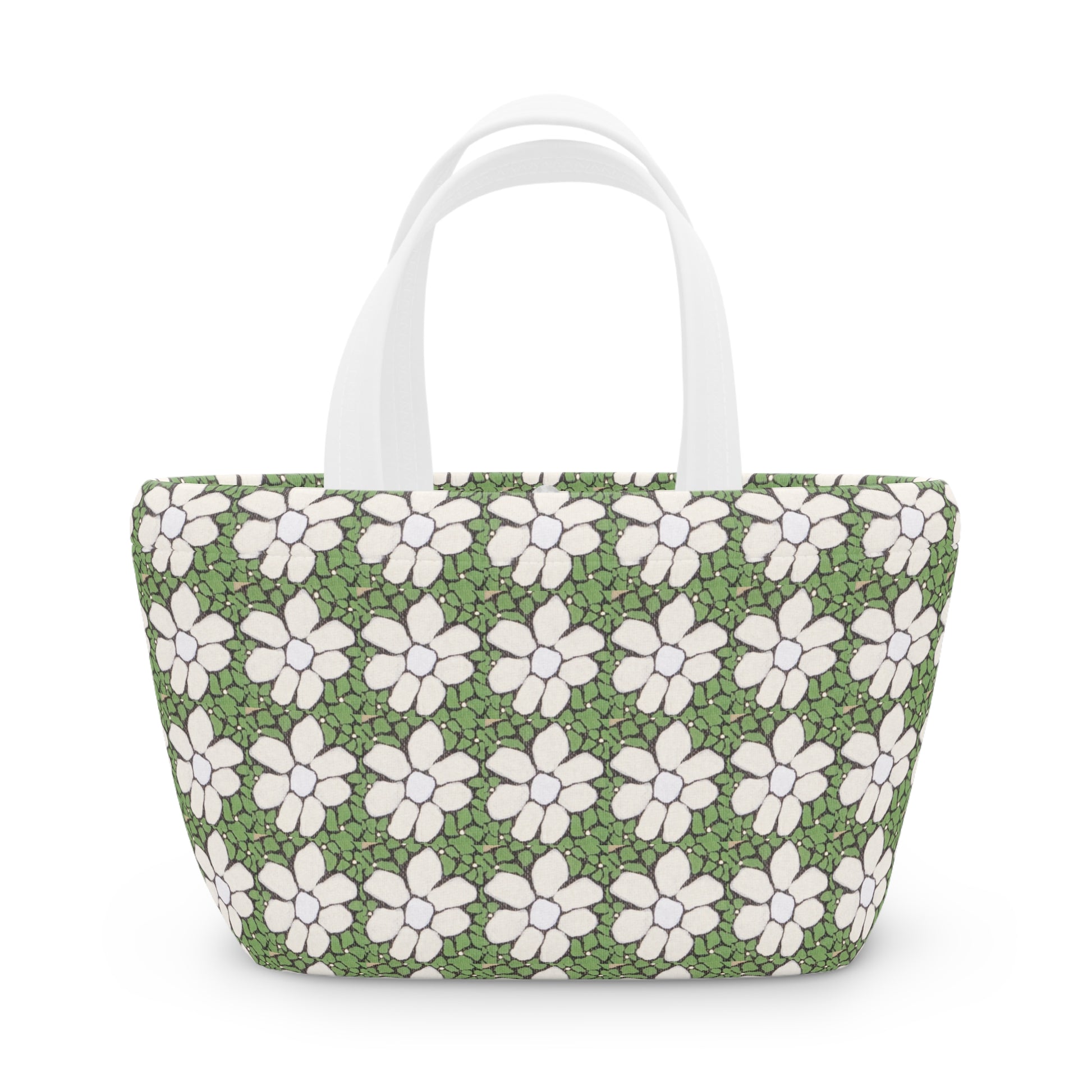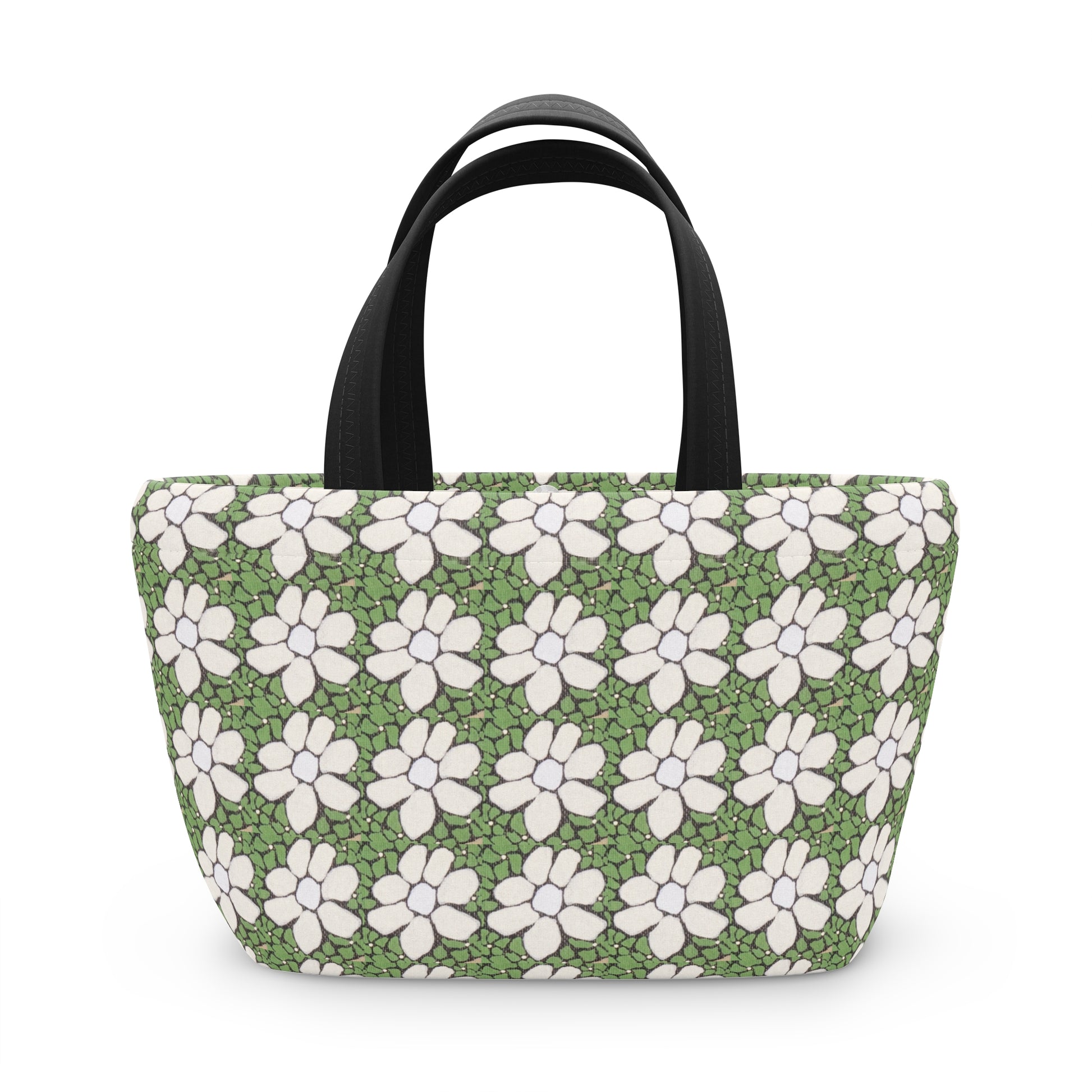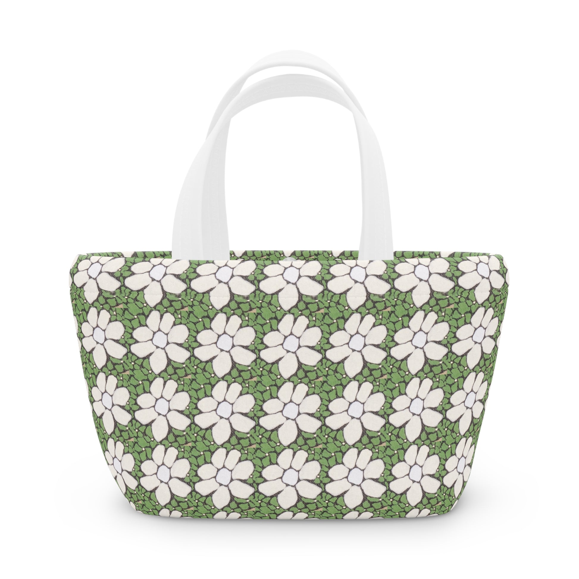 Floral Daisy Pattern Lunch Bag — Green White Retro Picnic Tote