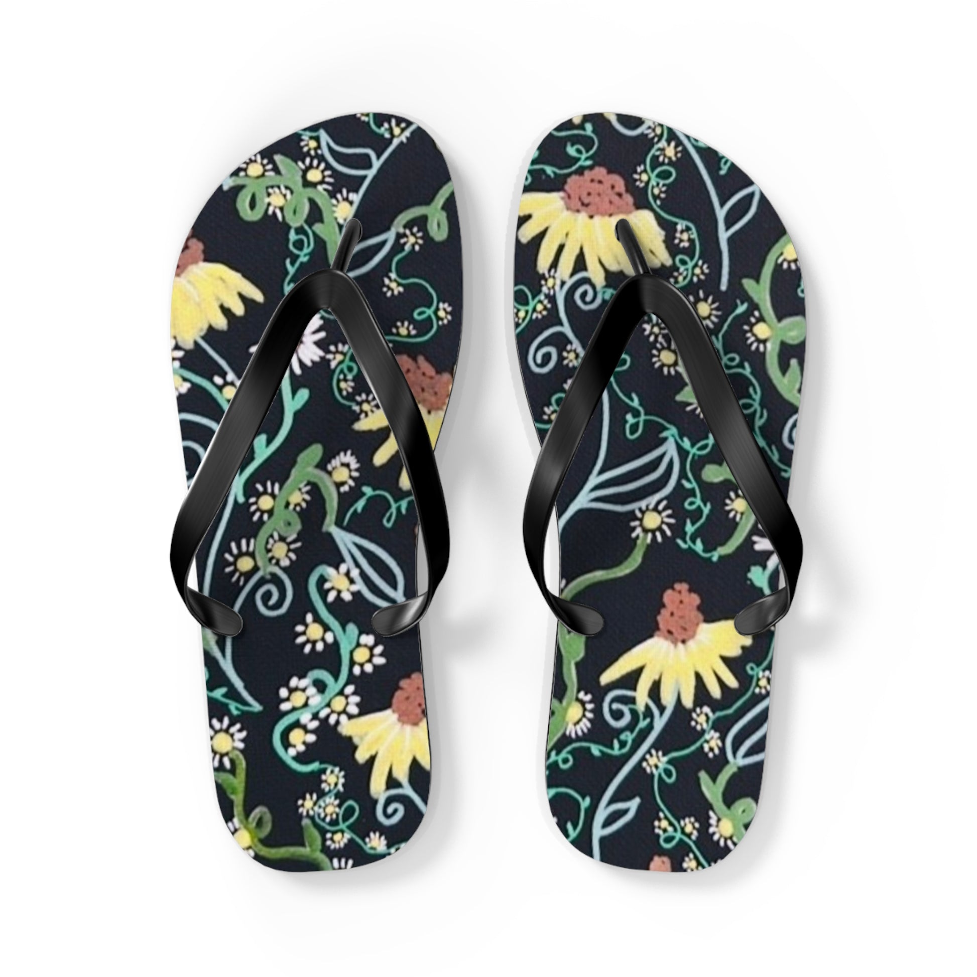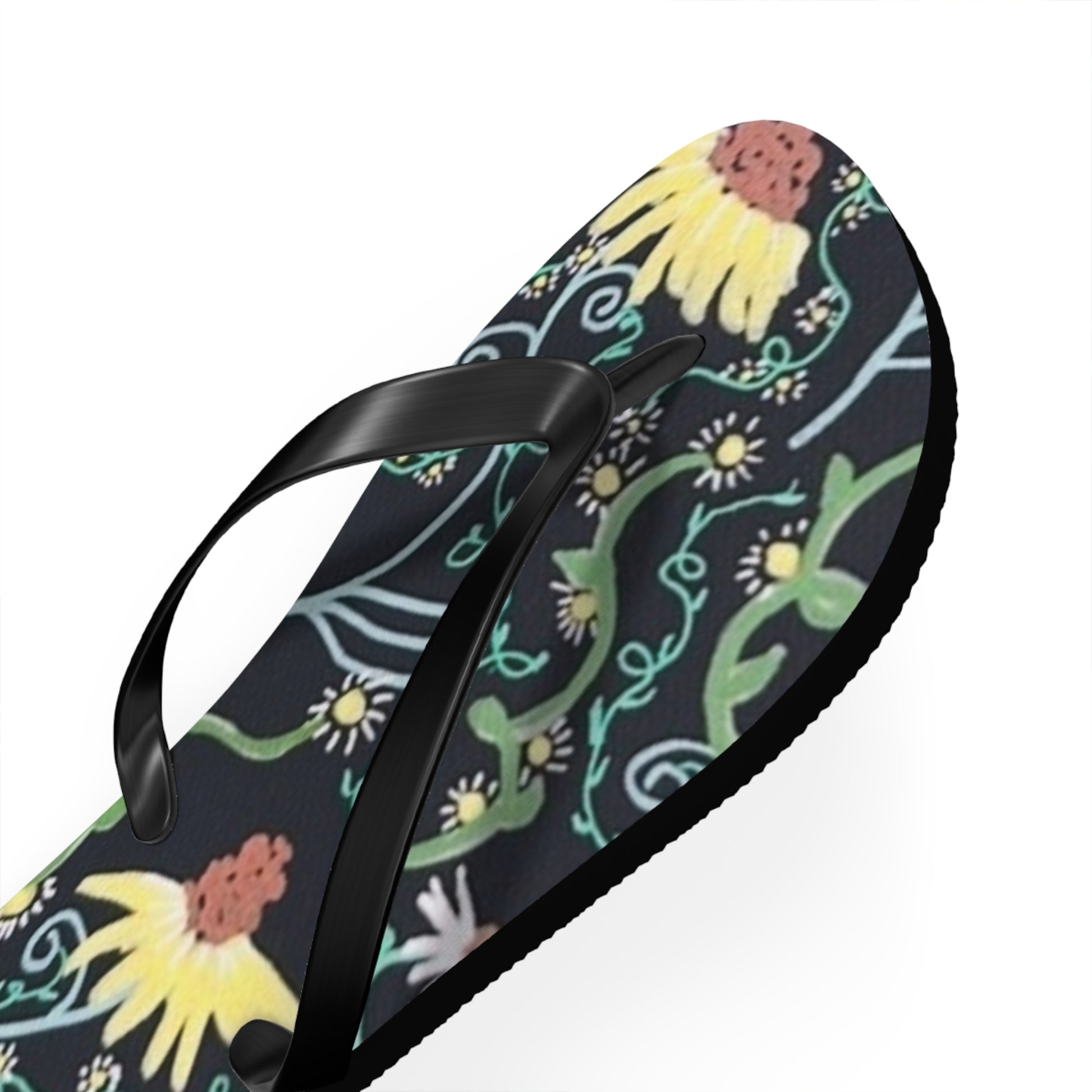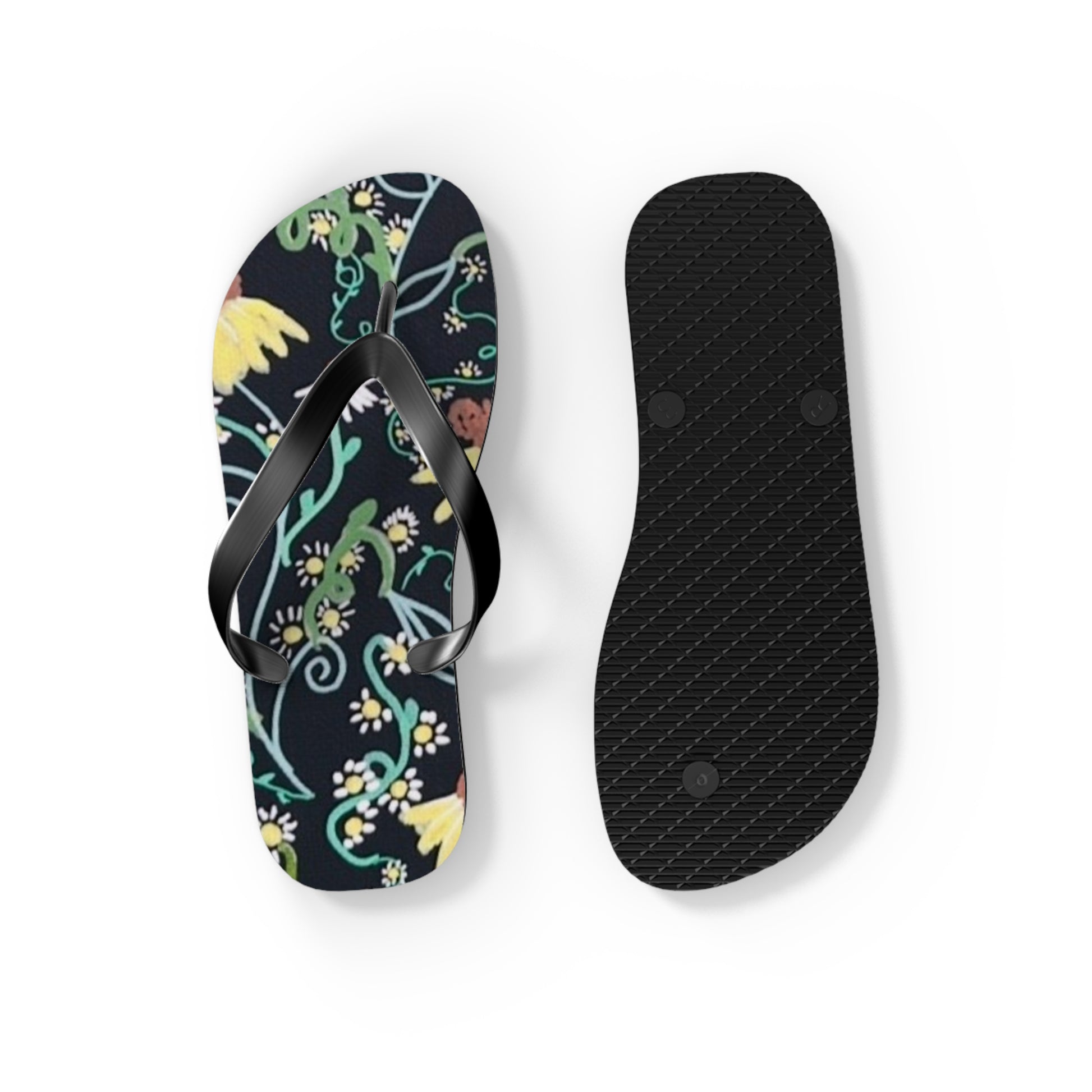 These lightweight flip flops bring a touch of hand-drawn botanical charm to sunlit afternoons and slow weekend mornings. The soft polyester suede footbed showcases a detailed floral pattern in vivid hues against a deep background, while the textured EVA sole cushions each step and keeps you steady on wet surfaces. Black PVC straps sit comfortably between the toes and the slim profile makes them easy to slip on for market runs, beach walks, or porch reading sessions. They run true to size and come in multiple sizes so you can grab a pair that fits your everyday rhythm.
