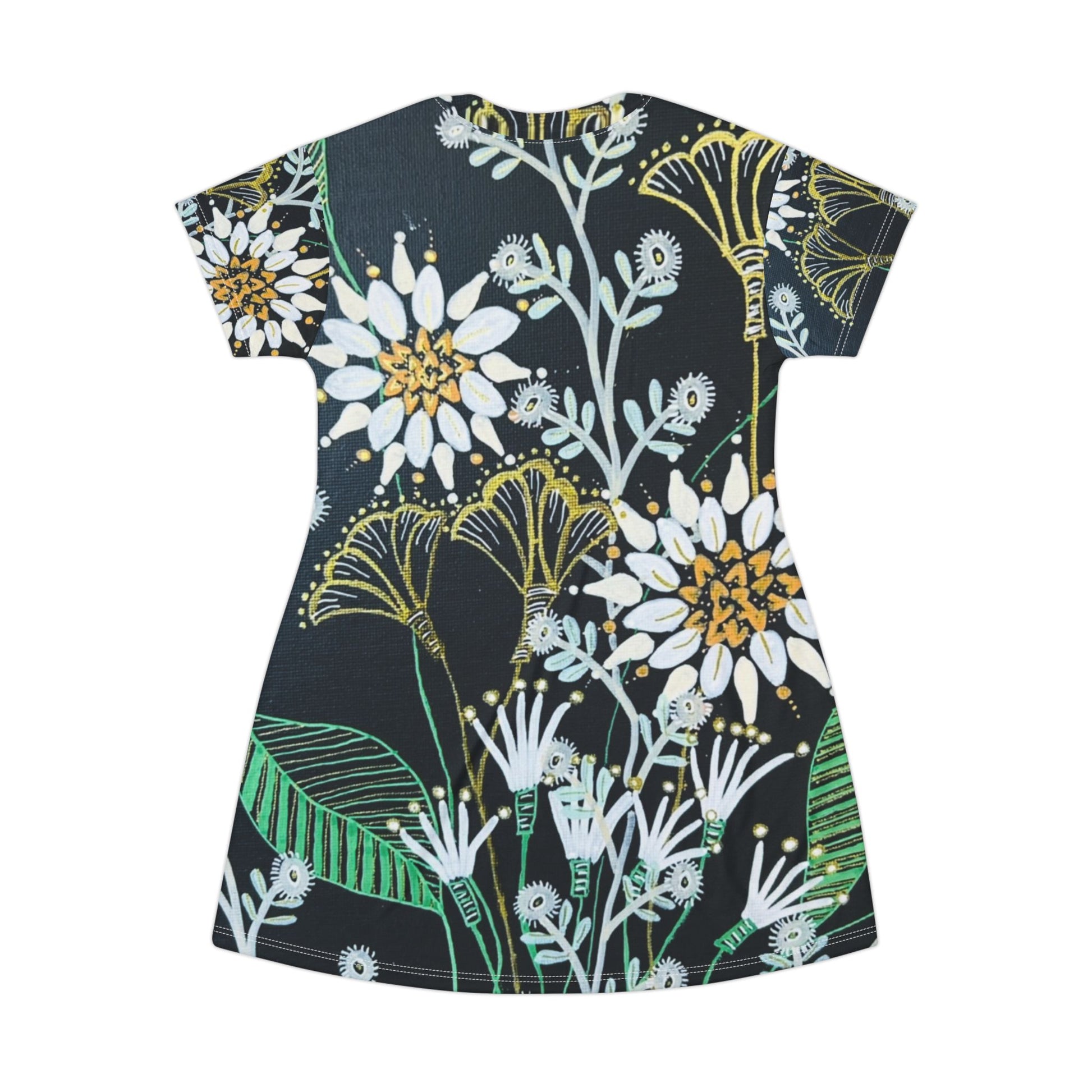 Golden Tangle Floral Meadow AOP T-Shirt Dress — White Daisies on Dark Botanical Print
