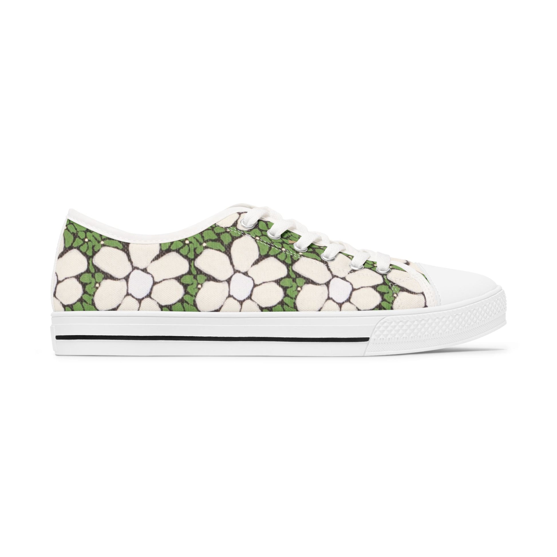 Step into a sunlit garden with these low top sneakers—soft canvas blooms against a mossy green backdrop that feels both vintage and fresh. The cushioned memory-foam insoles and EVA shock-absorbing layer keep each step light and steady, whether you’re wandering farmers’ markets, commuting through tree-lined streets, or sketching in a park. Leather-look reinforcement at the toe and sturdy metal eyelets add durability where you need it, while the full wraparound print keeps the floral motif uninterrupted from side to tongue. These sneakers wear like a favorite companion: easy, comfortable, and quietly expressive.
