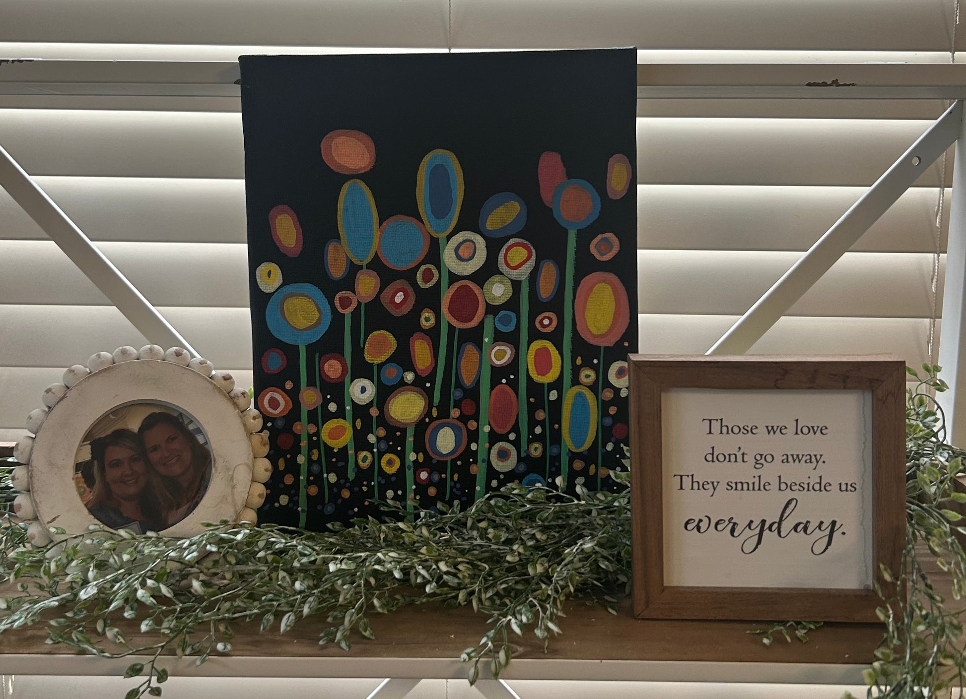 8 x 10 acrylic painting on stretched black canvas. A playful, punchy, and full of movement piece. It feels like a garden reimagined through a kaleidoscope: bold ovals, scattered dots, and vertical green stems that almost pulse upward. There’s something rhythmic and celebratory about it, like a floral parade frozen mid-step. It plays with vertical rhythm, vibrant contrast, and the joyful abstraction of botanical forms.