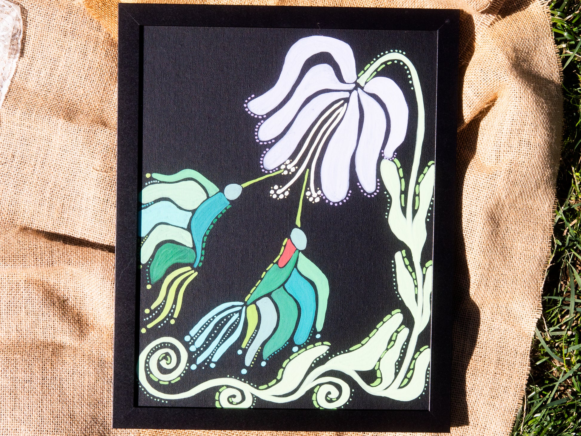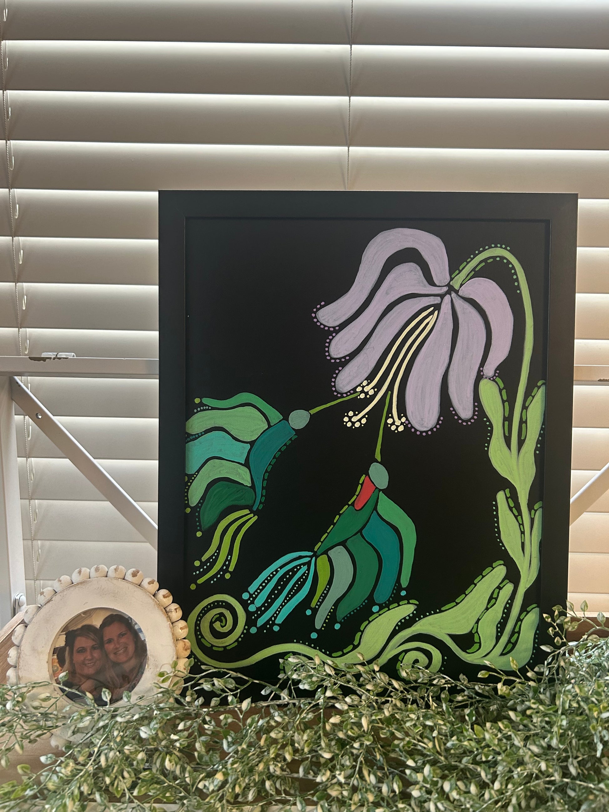 This 11x14 acrylic painting on black canvas board captures the bloom of wild petals and the flutter of vine-born motion. Framed and hand-painted, it’s a dance of color and curve—where garden shapes drift like wings and each stroke hums with quiet joy and botanical rhythm.