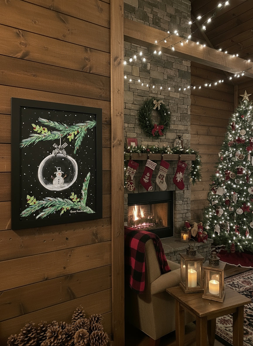 Meet Frosty, a snow-kissed memory preserved in paint. This 9 x 12 canvas board features a delicate ornament cradling a dapper snowman, surrounded by holly and pine. A checkered ribbon flutters like a whisper of winter wind, while snowflakes fall gently against the blackened sky. Signed by the artist, this piece invites warmth, whimsy, and a touch of holiday magic into your home.