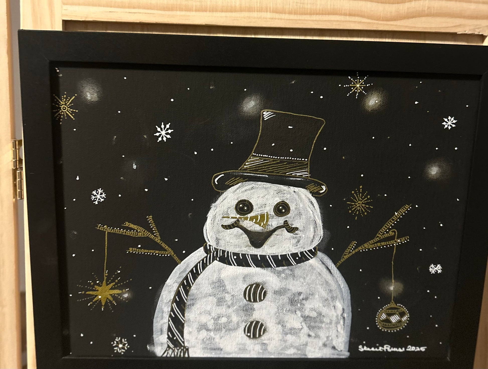 Set against a star-speckled black sky, this painting blends playful personality with elegant sparkle. Framed in black for a sleek finish, it’s a celebration of winter’s joy with a twist of style and a wink of gold.