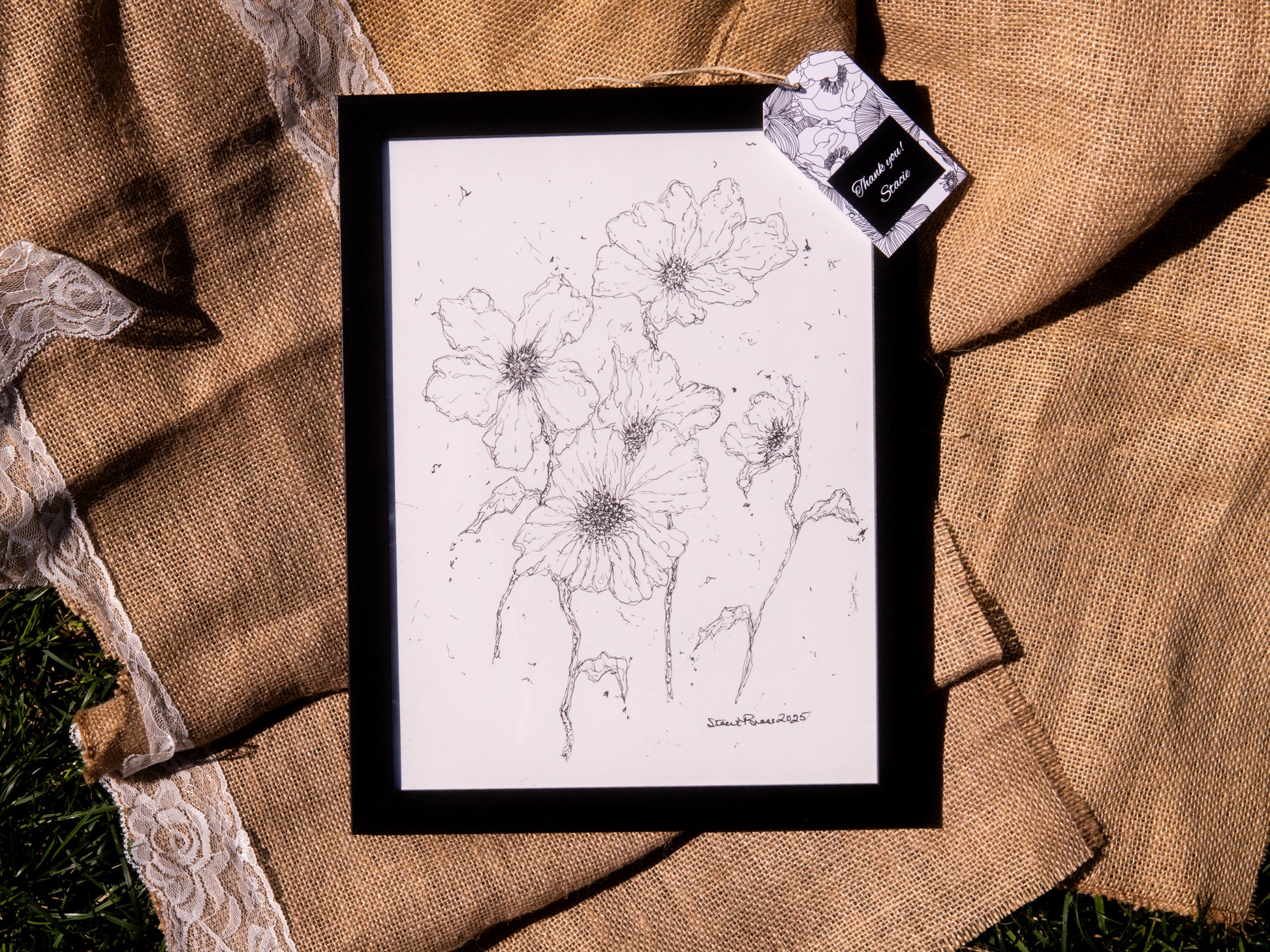 This 9x12 framed floral illustration, rendered in permanent black marker, captures the quiet elegance of five blooming stems. Each petal is drawn with fine, expressive lines—textured and crinkled like memory itself. The composition invites stillness, with its gentle flow and lifelike detail, offering a moment of pause in any space it graces.