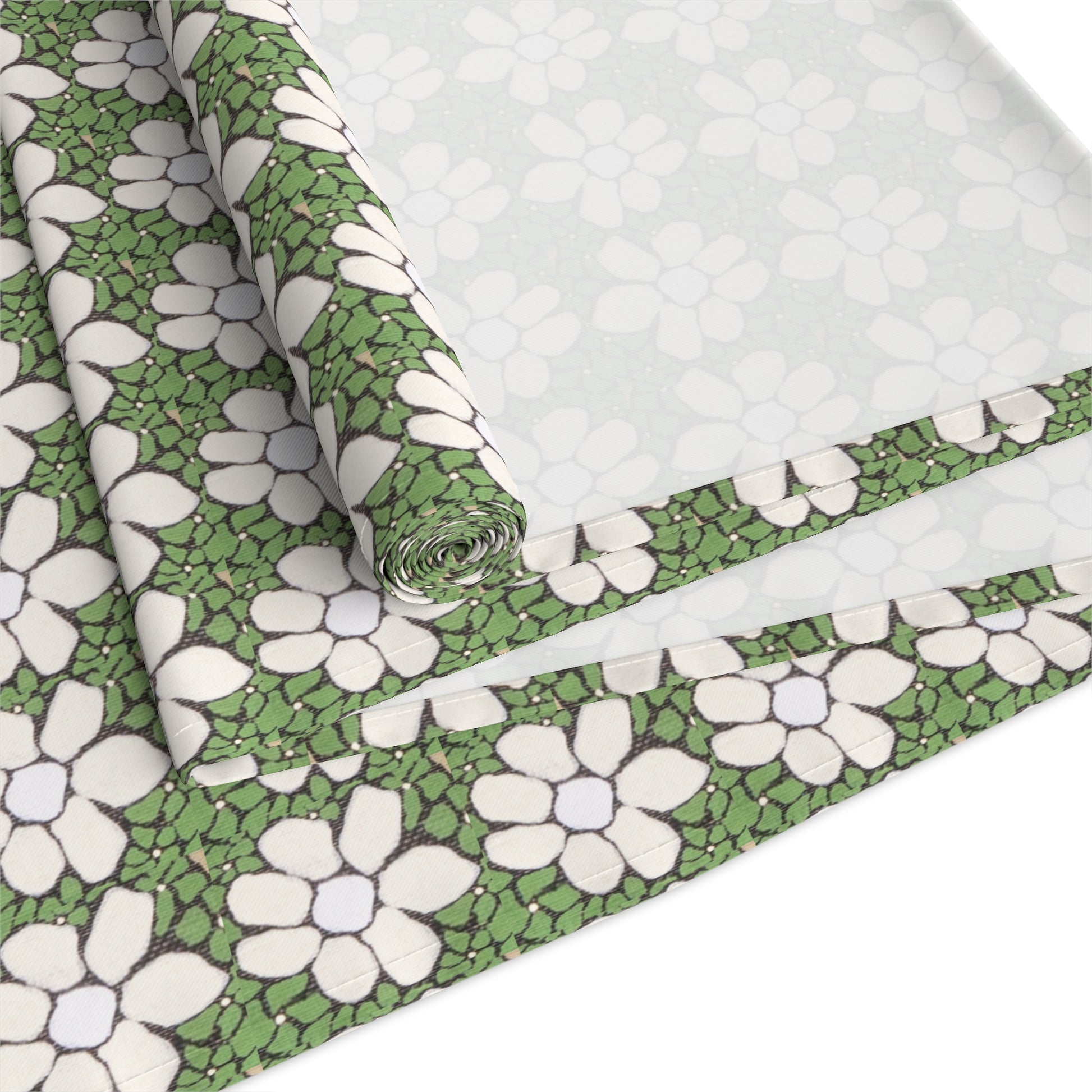 Green Floral Table Runner — White Daisy Pattern Cotton-Poly Dining Decor