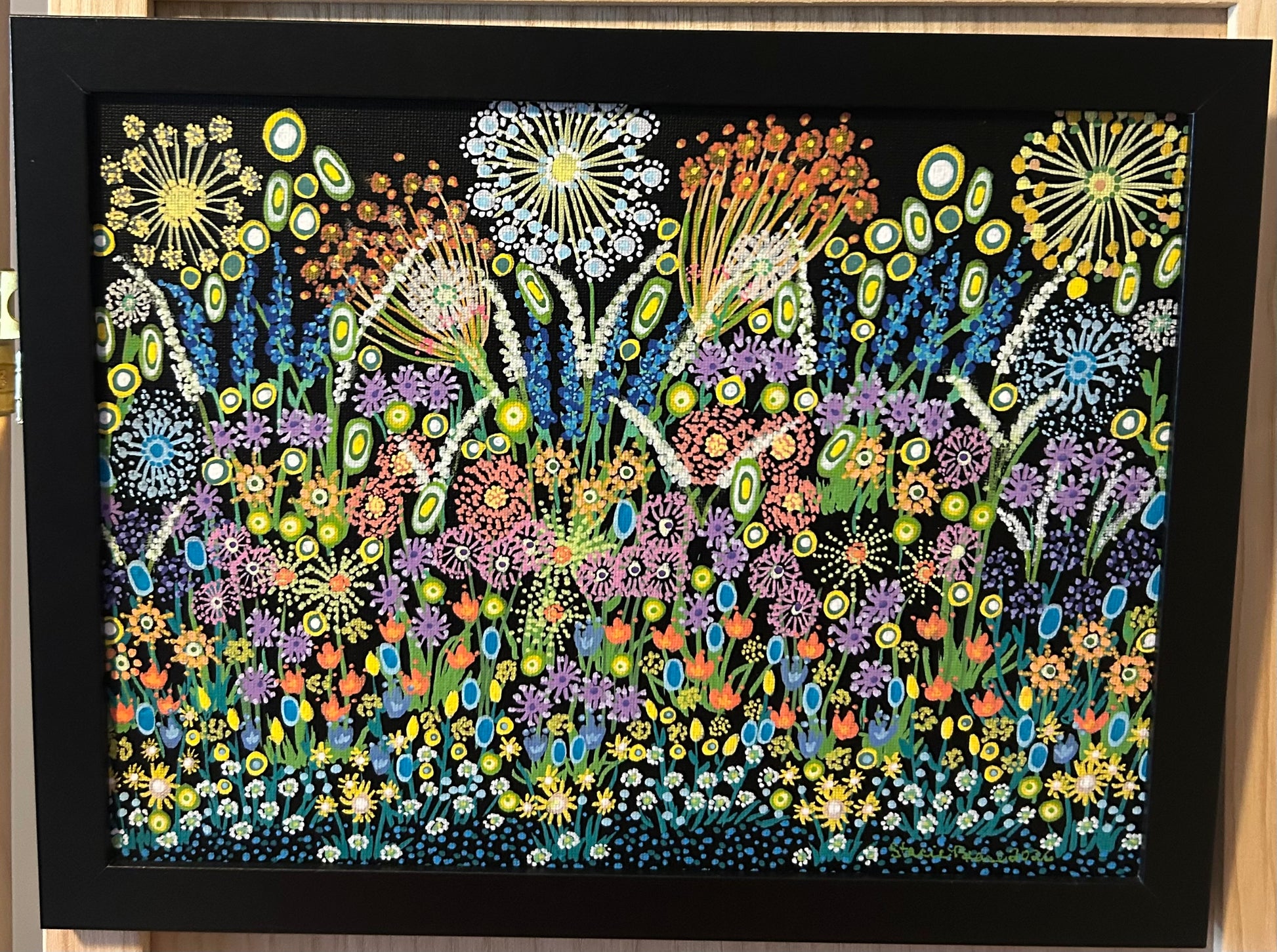 This one-of-a-kind acrylic painting is framed in sleek black, allowing its vibrant palette to pop with cheerful energy. From dot-patterned blossoms to swirling stems, every detail invites you to smile, breathe deep, and remember the magic tucked into everyday moments.