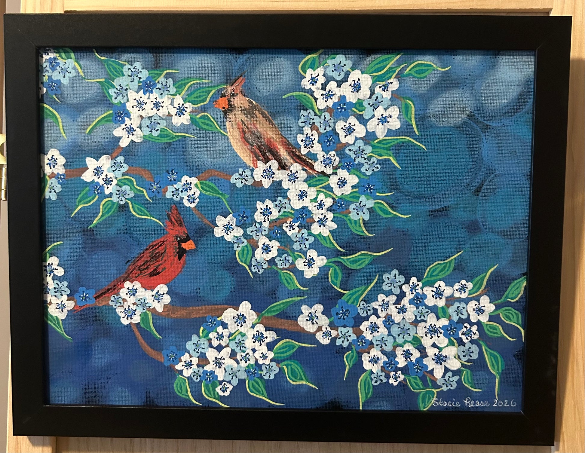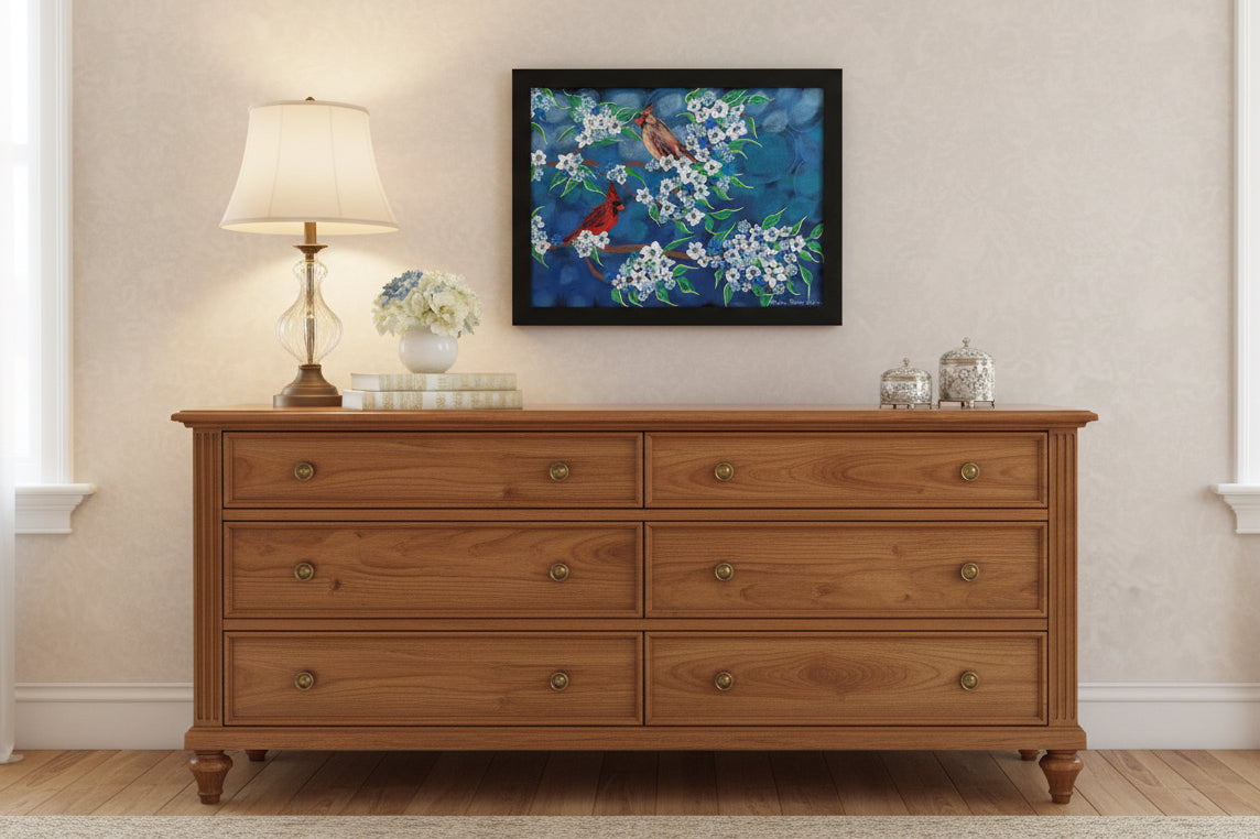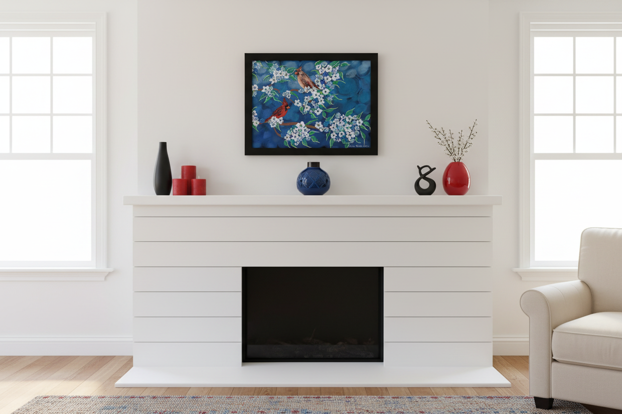 Two cardinals—one crimson, one soft russet—perch tenderly among blooming branches, their presence a quiet whisper of love that lingers. Set against a dreamy wash of celestial blues, this hand-painted piece evokes the sacred hush of remembrance and the gentle nearness of those we hold dear. Each blossom, each feathered detail, is brushed with intention, inviting the viewer to pause, reflect, and feel the warmth of a message from beyond.