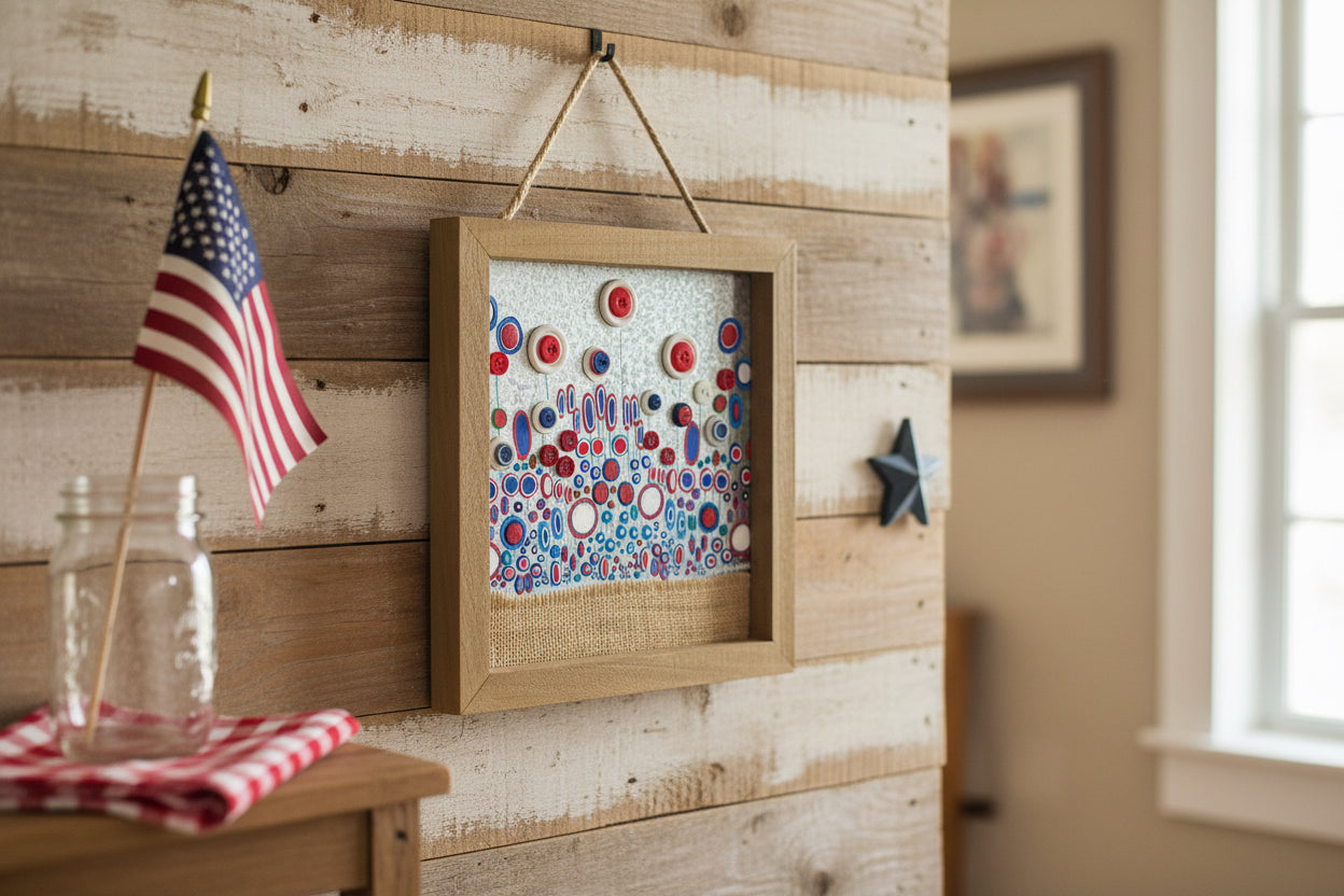A strip of burlap adds rustic texture, and the light wood frame with rope hanger completes the piece with handcrafted charm. Perfect for patriotic holidays, gallery walls, or everyday reminders of resilience and joy.