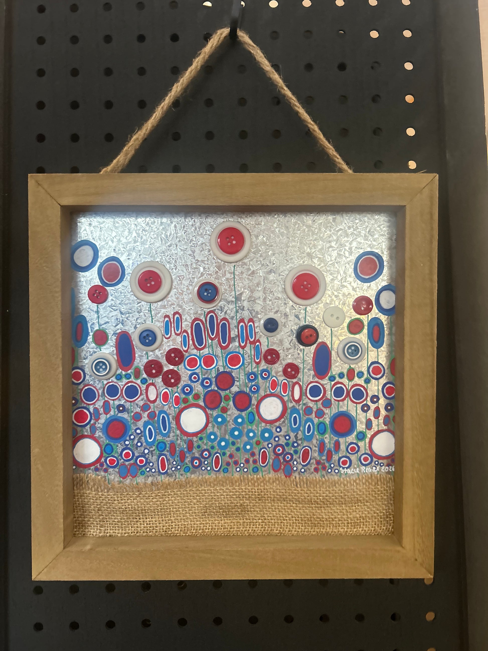 Bold, joyful, and full of heart—Independence Meadow is a celebration of freedom in bloom. This 10 x 10 inch mixed media artwork features a dynamic arrangement of painted and affixed button-like forms in vibrant reds, whites, and blues, set against a shimmering galvanized metal canvas. The metallic background catches the light like a summer sky, while the circular motifs evoke wildflowers, fireworks, and the playful rhythm of a meadow in motion.