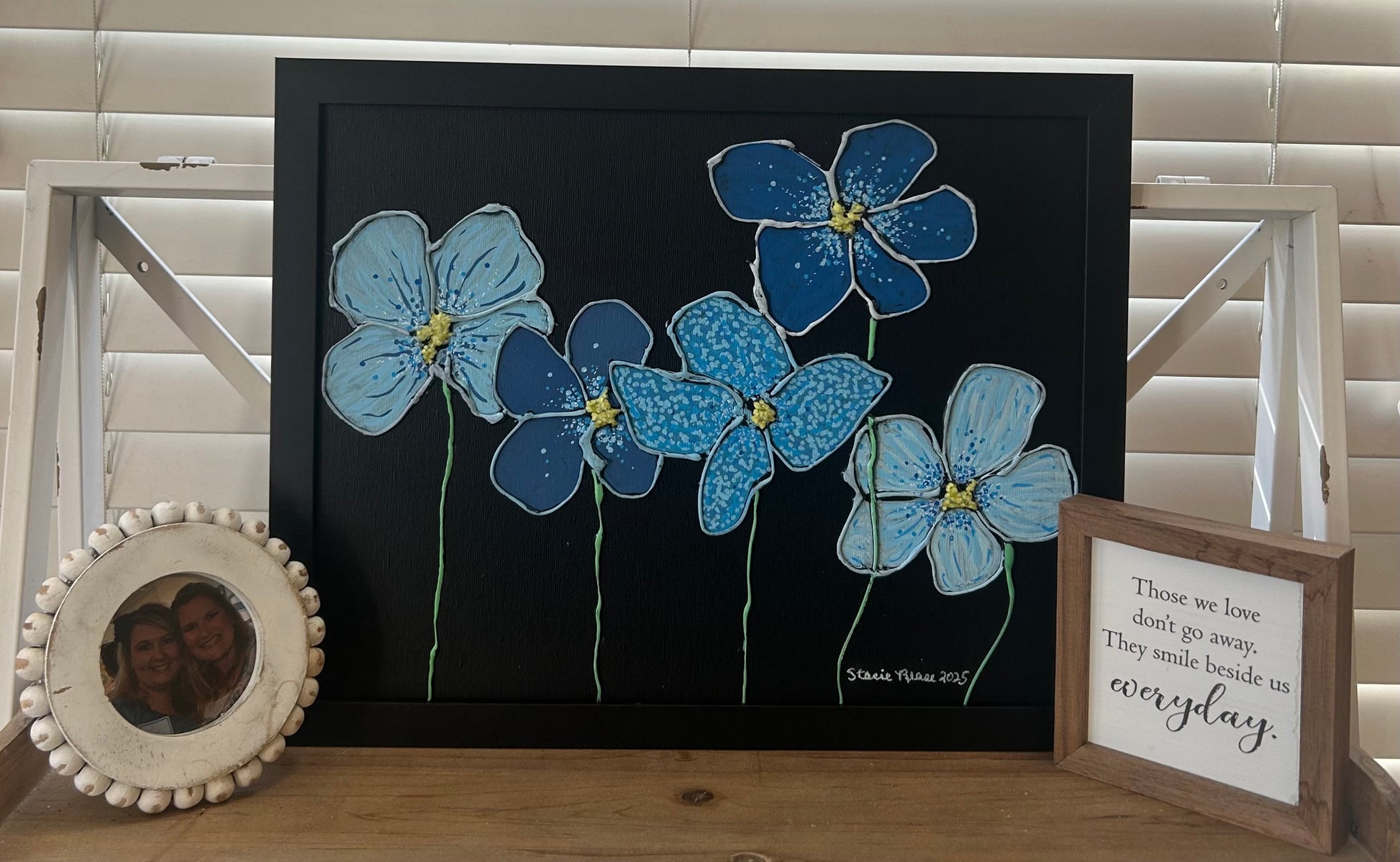 A bloom that won’t stay quiet. This 11x14 framed acrylic painting features six stylized blue flowers outlined with intention—each petal edged to rise from the canvas in a soft, dimensional effect. Set against a deep black background, the blossoms appear to float, creating a gentle 3D illusion that invites touch and emotion.