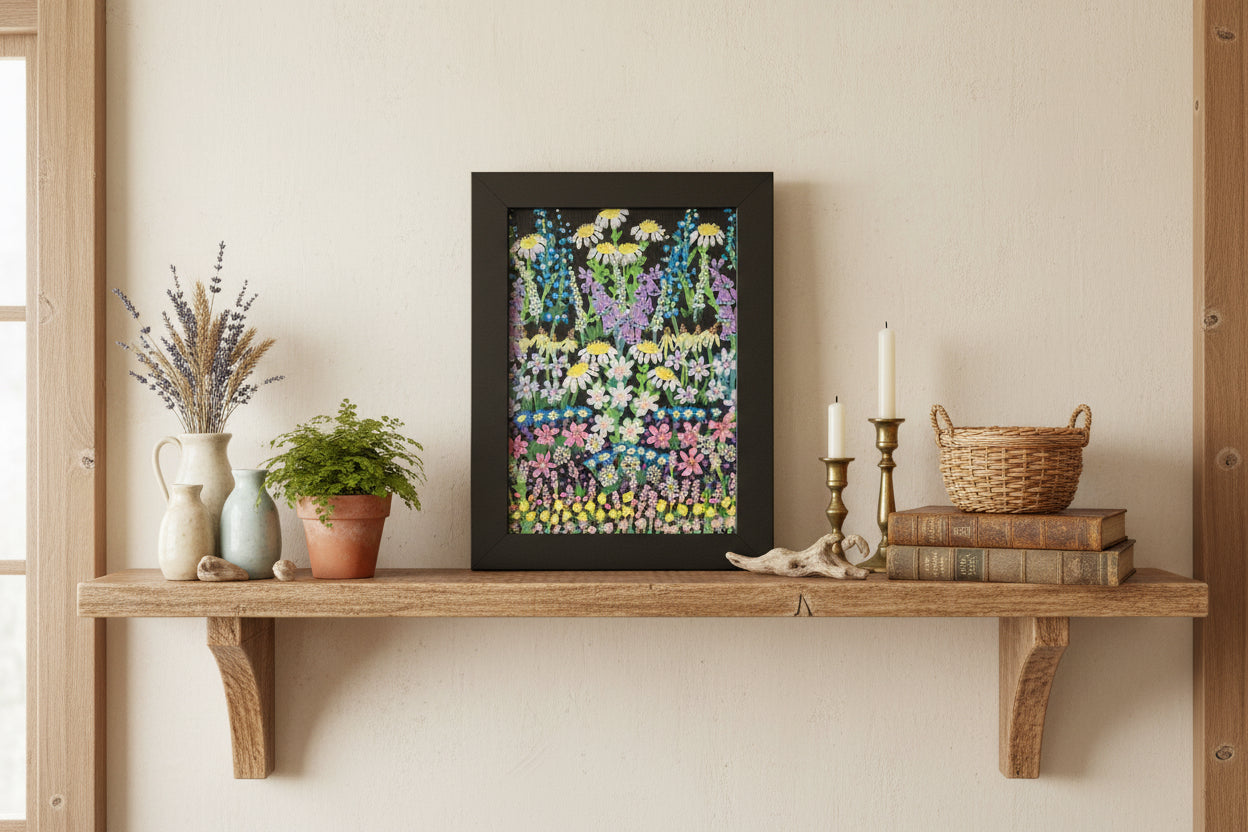 Little Wonders is a tiny garden bursting with color—an enchanting mix of playful blooms layered together like a joyful secret meadow. Painted as a 5x7 acrylic original on black canvas board, the dark base makes every petal pop with extra vibrancy and whimsy. Framed in sleek black, this petite piece feels like a pocket‑sized world where flowers dance, colors chatter, and happiness grows in every corner.