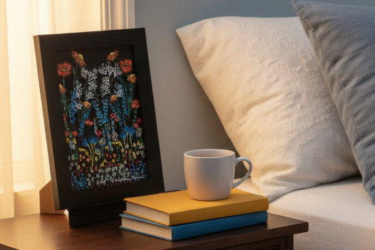 With vibrant reds, sunny yellows, soft whites, and playful blues, the flowers mingle in a whimsical dance, echoing the heart of a meadow in full bloom. This sister piece to The Dainty Móinéar is perfect for pairing or standing alone as a radiant reminder of life’s little joys.