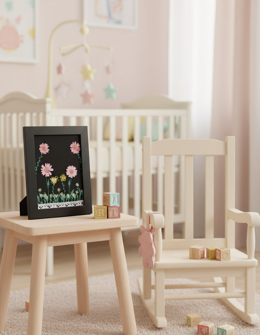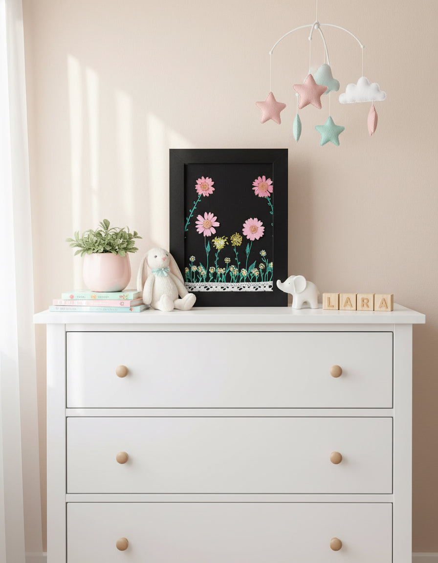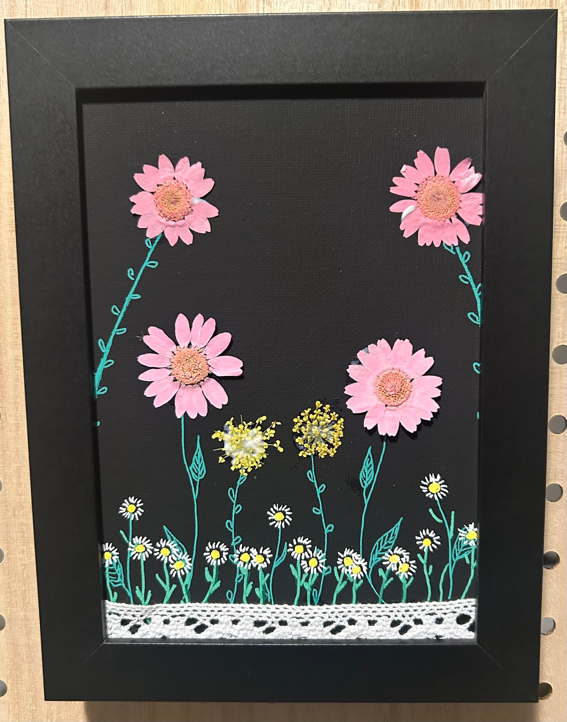 This enchanting 5 x 7 acrylic painting is a garden of whimsy brought to life on black canvas board. Soft pink blooms rise in gentle arcs above a bed of tiny yellow and white flowers, each lovingly accented with real pressed petals for a touch of nature’s texture. Fine-line stems and leaves dance across the surface, while a delicate lace ribbon adds a vintage flourish along the bottom edge. Framed in sleek black, this piece feels like a secret springtime tucked inside a shadowbox—ready to charm any cozy nook or heartfelt gift.