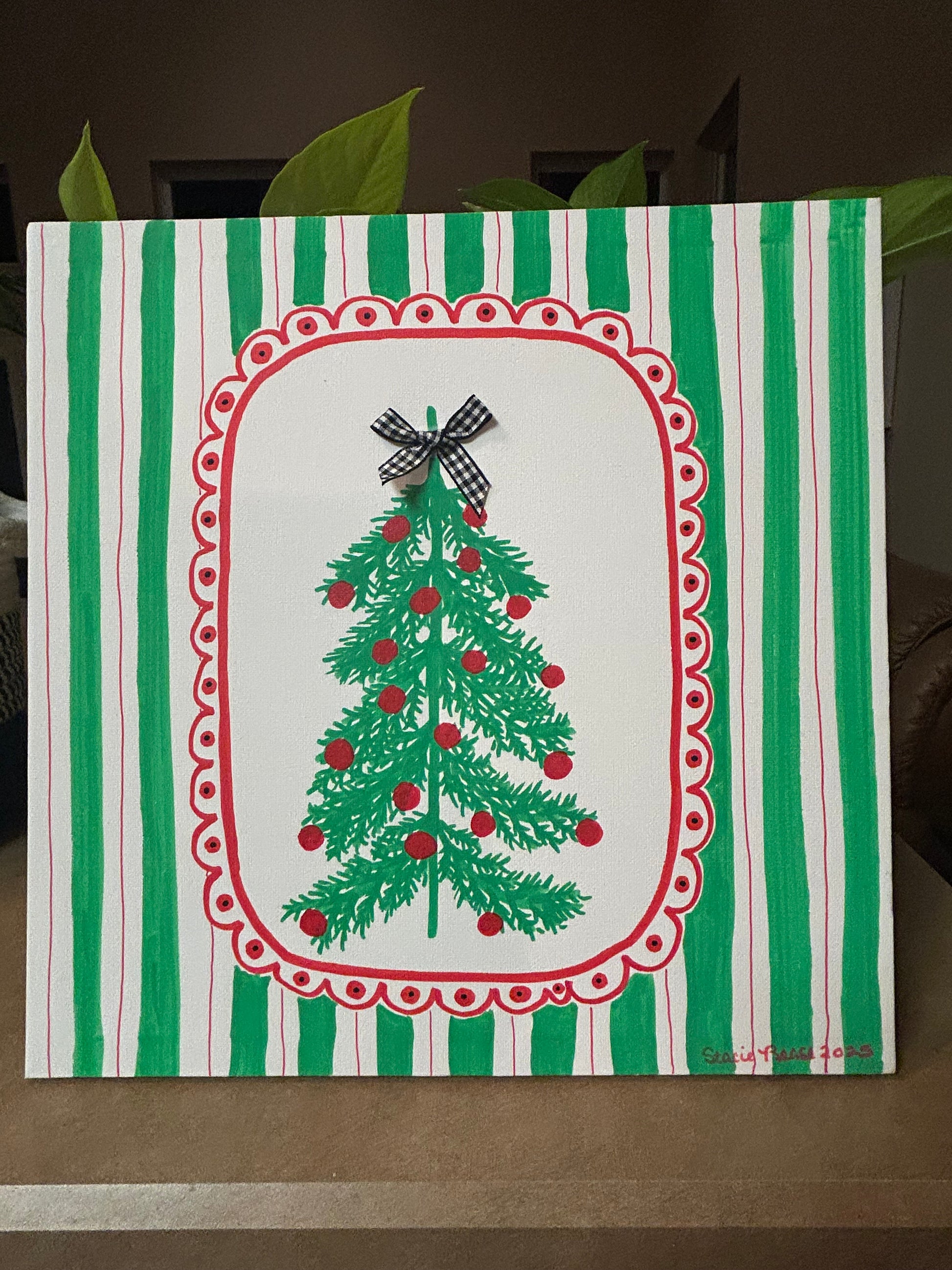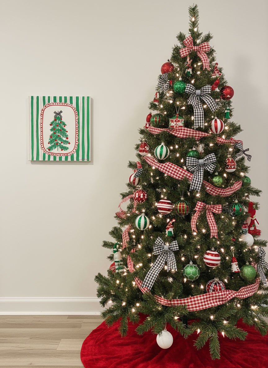 Infuse your space with nostalgic cheer and timeless charm. This hand-painted Christmas canvas features a stylized evergreen tree adorned with vibrant red ornaments and crowned by a whimsical black-and-white checkered bow. Framed within a scalloped red oval and set against candy-striped green and white, the design evokes vintage wrapping paper and cozy holiday mornings.