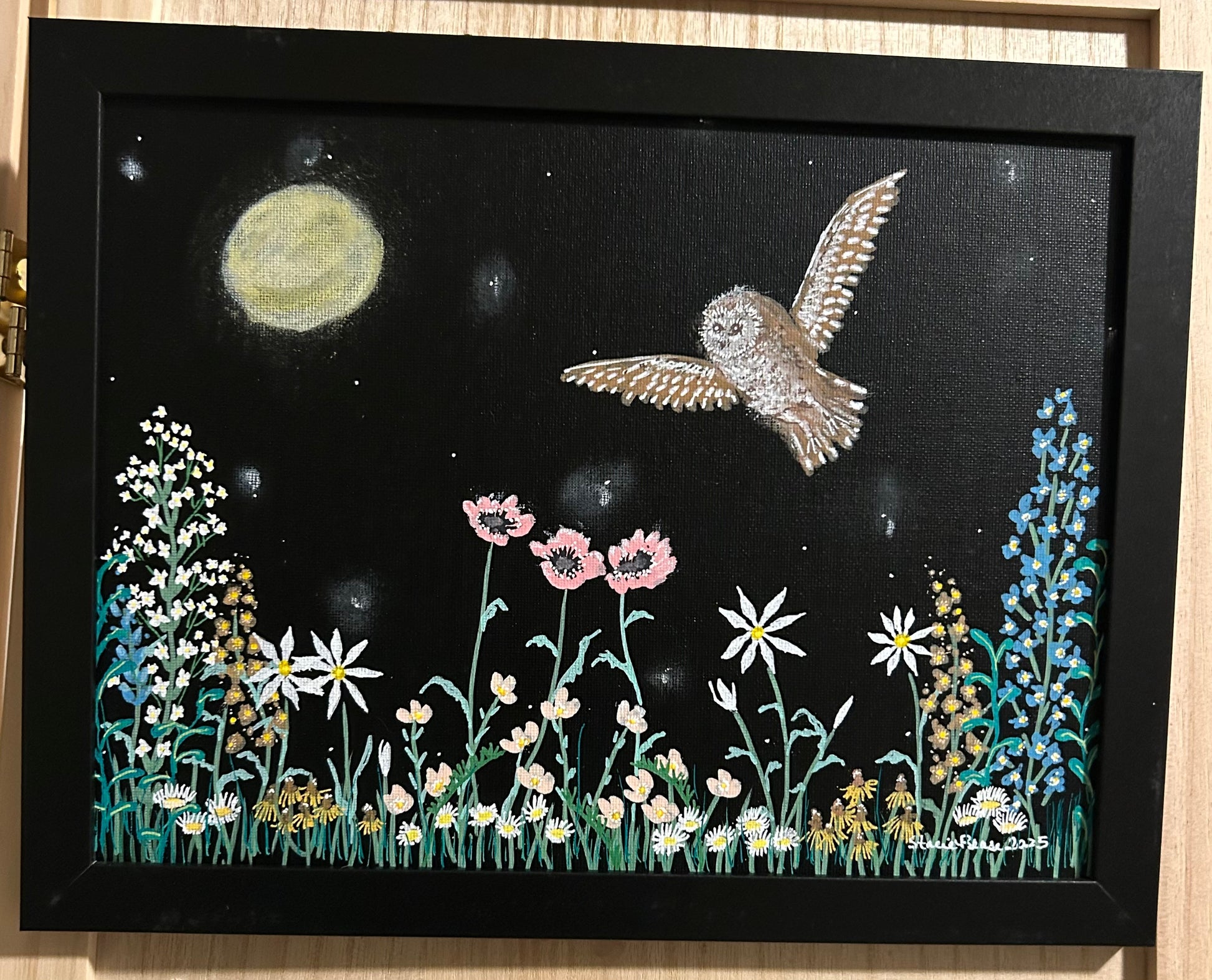 Painted on rich black canvas, this 9x12 piece glows with contrast and wonder. Delicate florals in soft pinks, golden yellows, and twilight blues rise from the earth, their fine-line details whispering stories of resilience and grace. The moon, full and luminous, casts a silver hush over the scene, while the owl—rendered in earthy browns and soft whites—hovers in perfect harmony with the night.