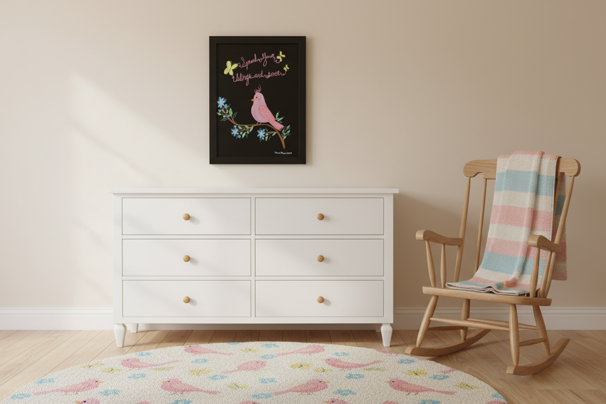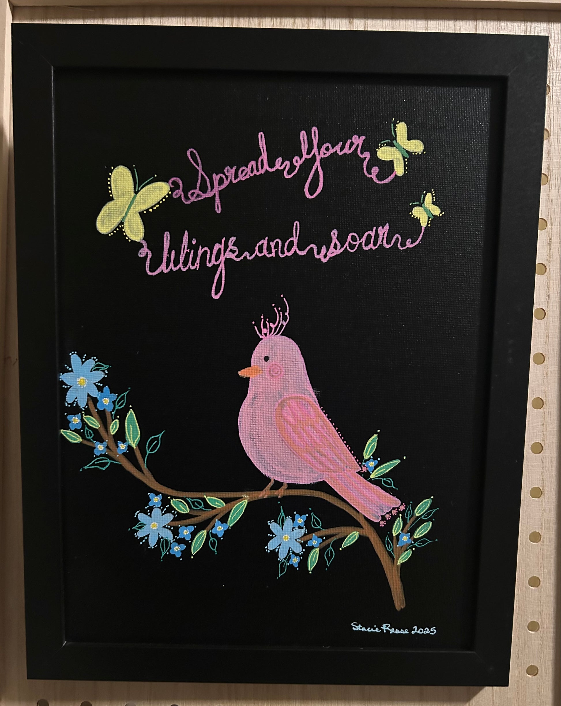 A rosy little bird perches on a blooming branch, surrounded by fluttering butterflies and a gentle reminder to dream big: “Spread your wings and soar.” Painted on rich black canvas, this cheerful piece glows with playful color and uplifting charm—an enchanting addition to any nursery, child’s room, or cozy corner where imagination takes flight.