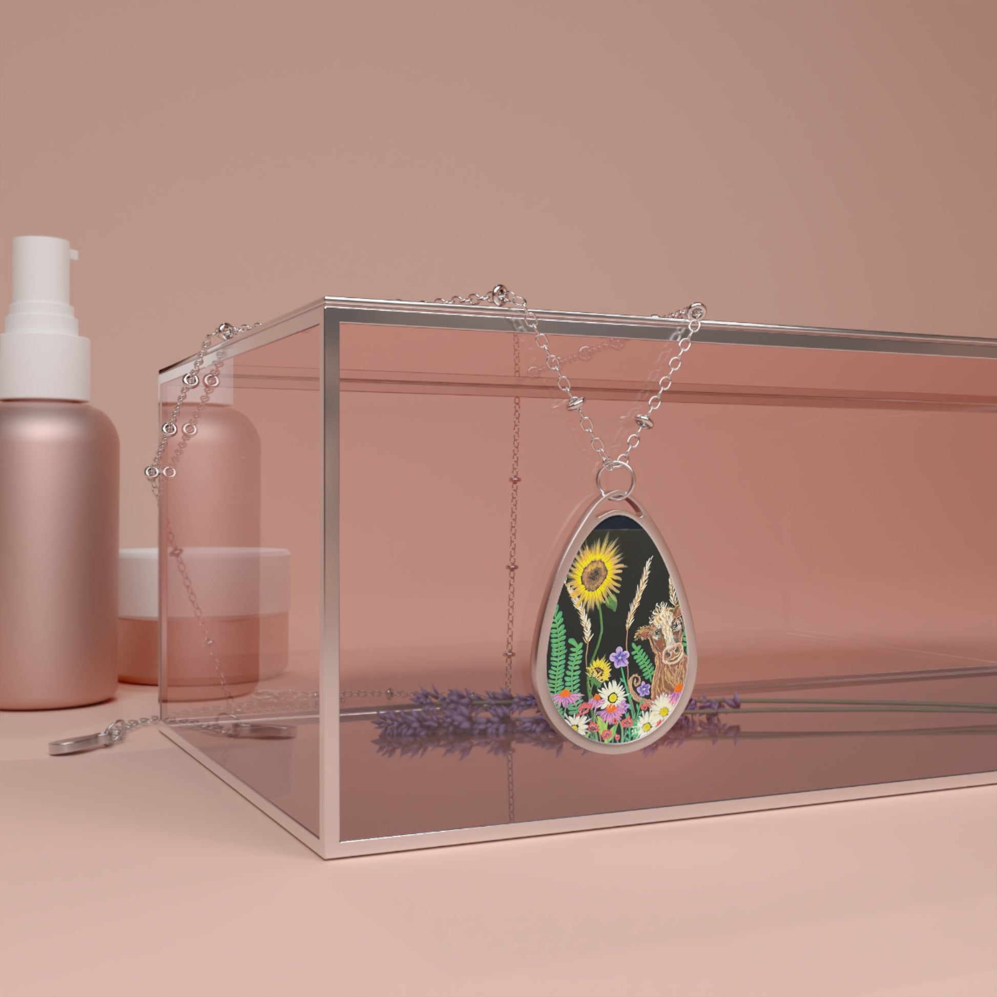Sunflower Garden Oval Necklace — Floral Teardrop Pendant Jewelry