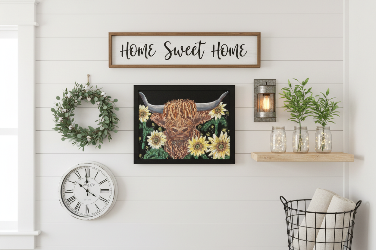 Bring a little sunshine and a whole lot of personality into your space with Sunflower Sweetheart, an 11×14 original acrylic painting that radiates pure joy. Painted on rich black canvas board and framed in sleek black, this whimsical Highland cow peeks out from a cluster of golden sunflowers—soft, shaggy, and absolutely full of heart.