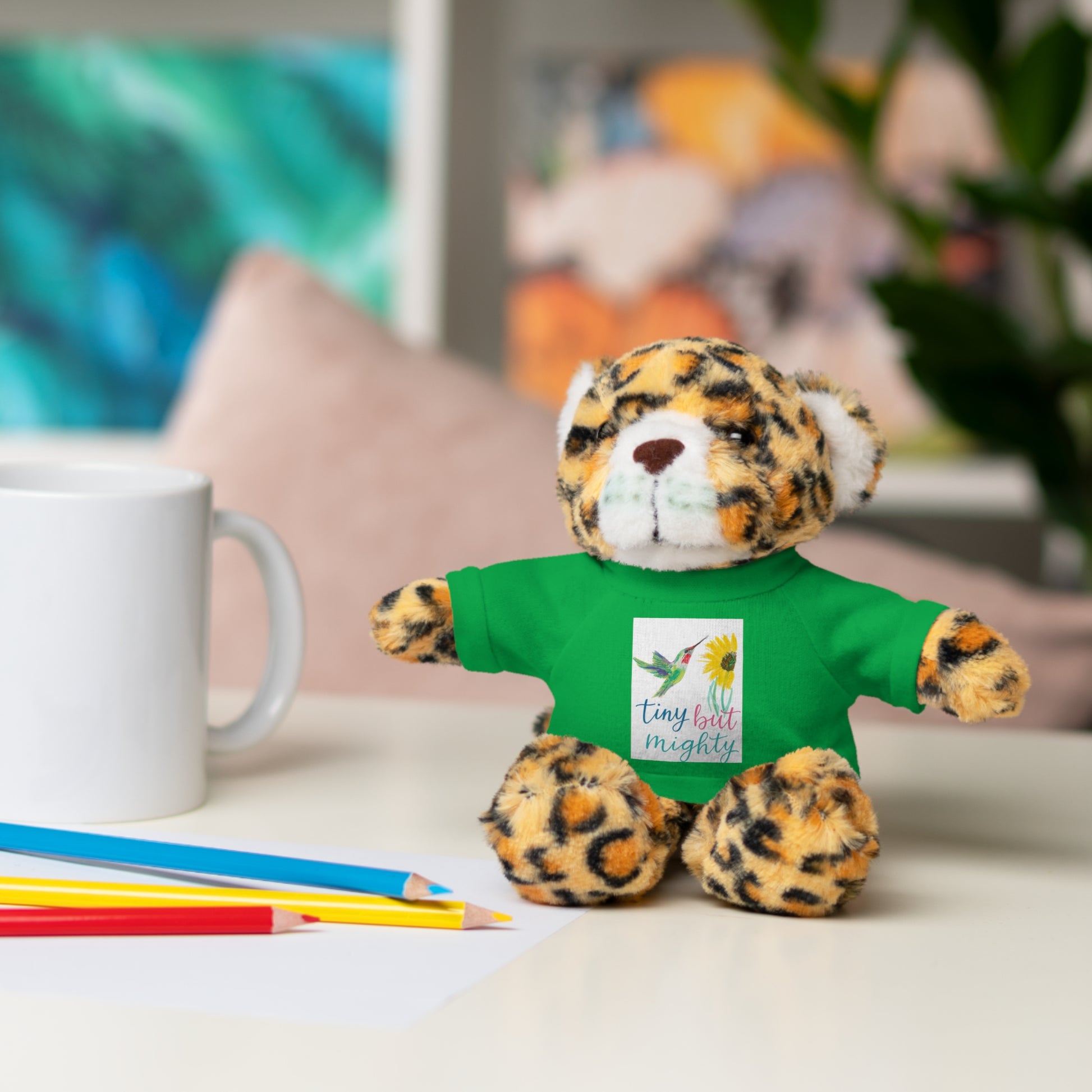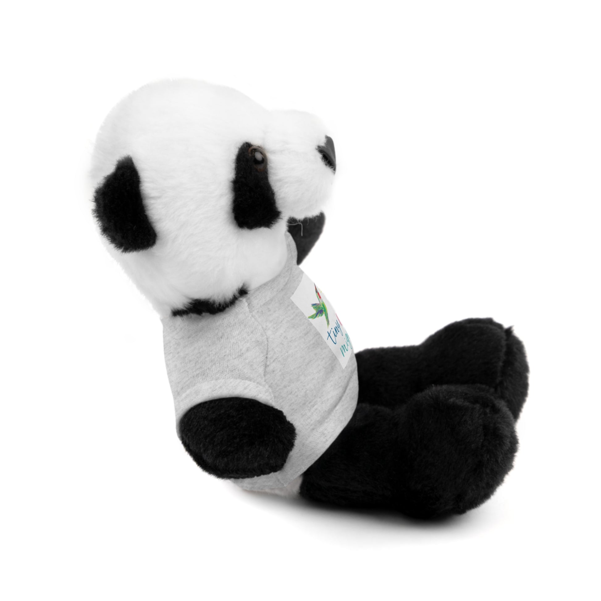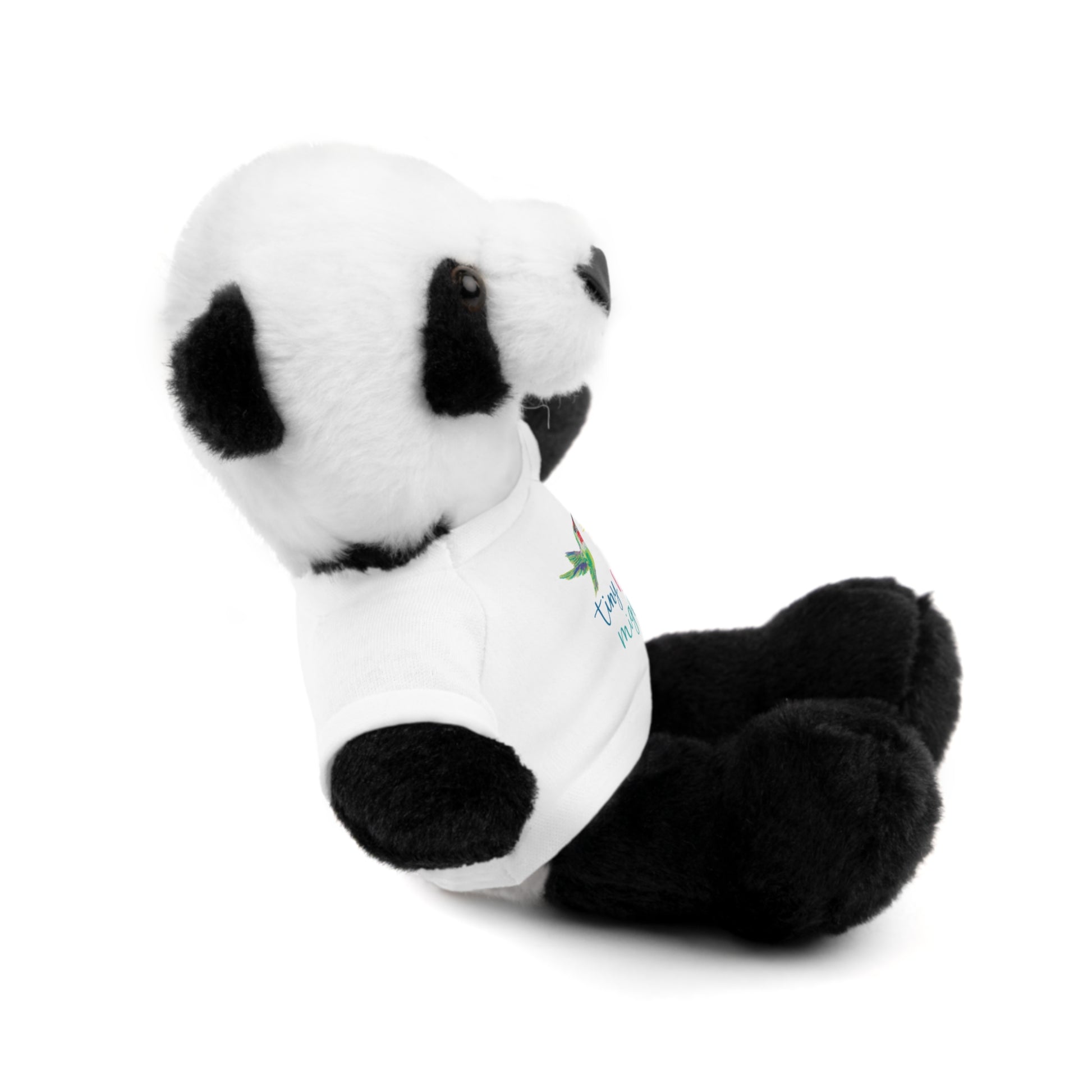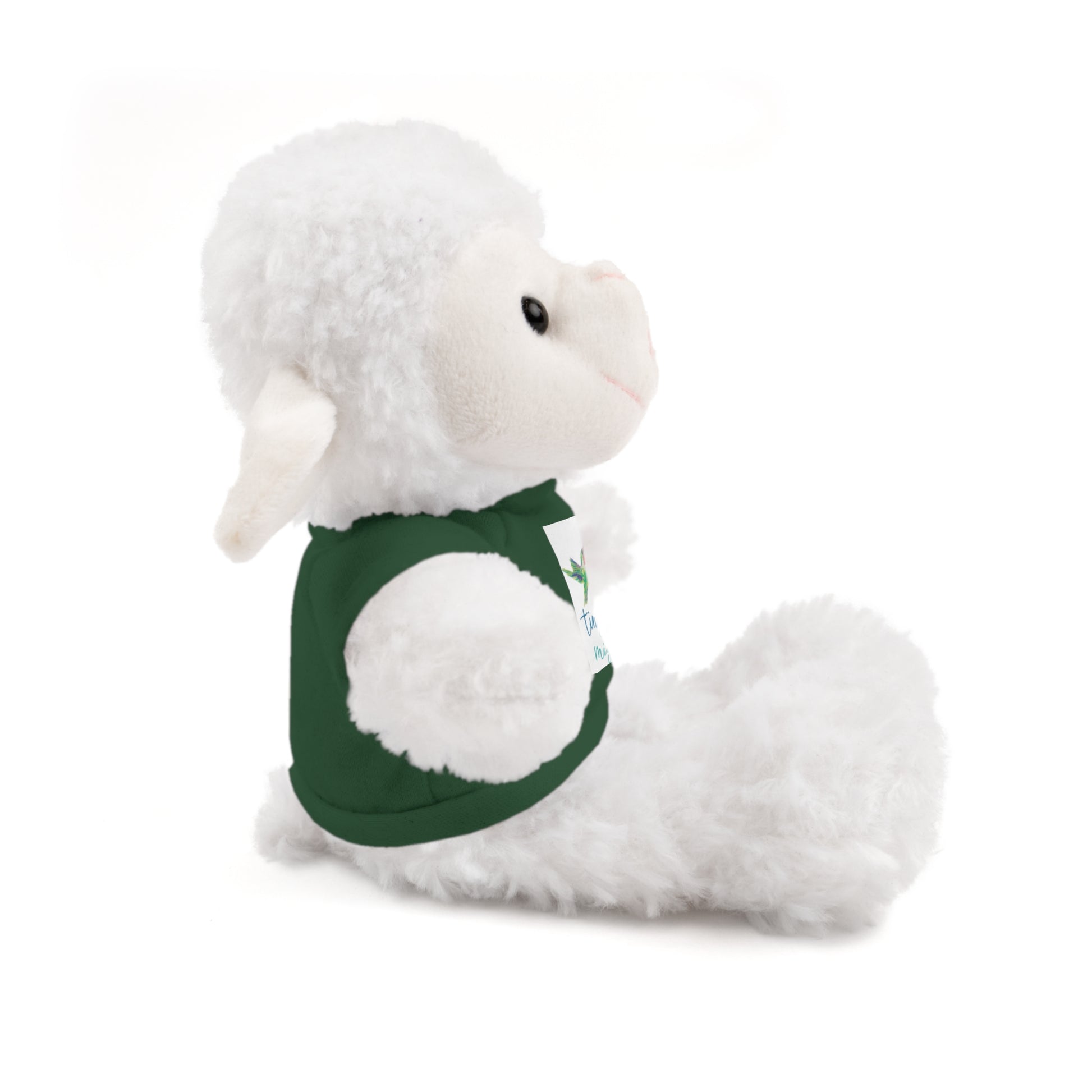Soft, huggable plush animals dressed in a tiny cotton tee, made to be cuddled and carried everywhere. Each 8" (20 cm) toy has a fluffy exterior, gentle weighted filling, and a sewn-in label for durability. Choose from six animal characters — Bear, Sheep, Bunny, Jaguar, Panda, or Lion — and pick a shirt color to match their little personality. The tee is 100% cotton and accepts printed designs or names, so these companions feel personal and ready for bedtime stories, stroller rides, and quiet moments of comfort.