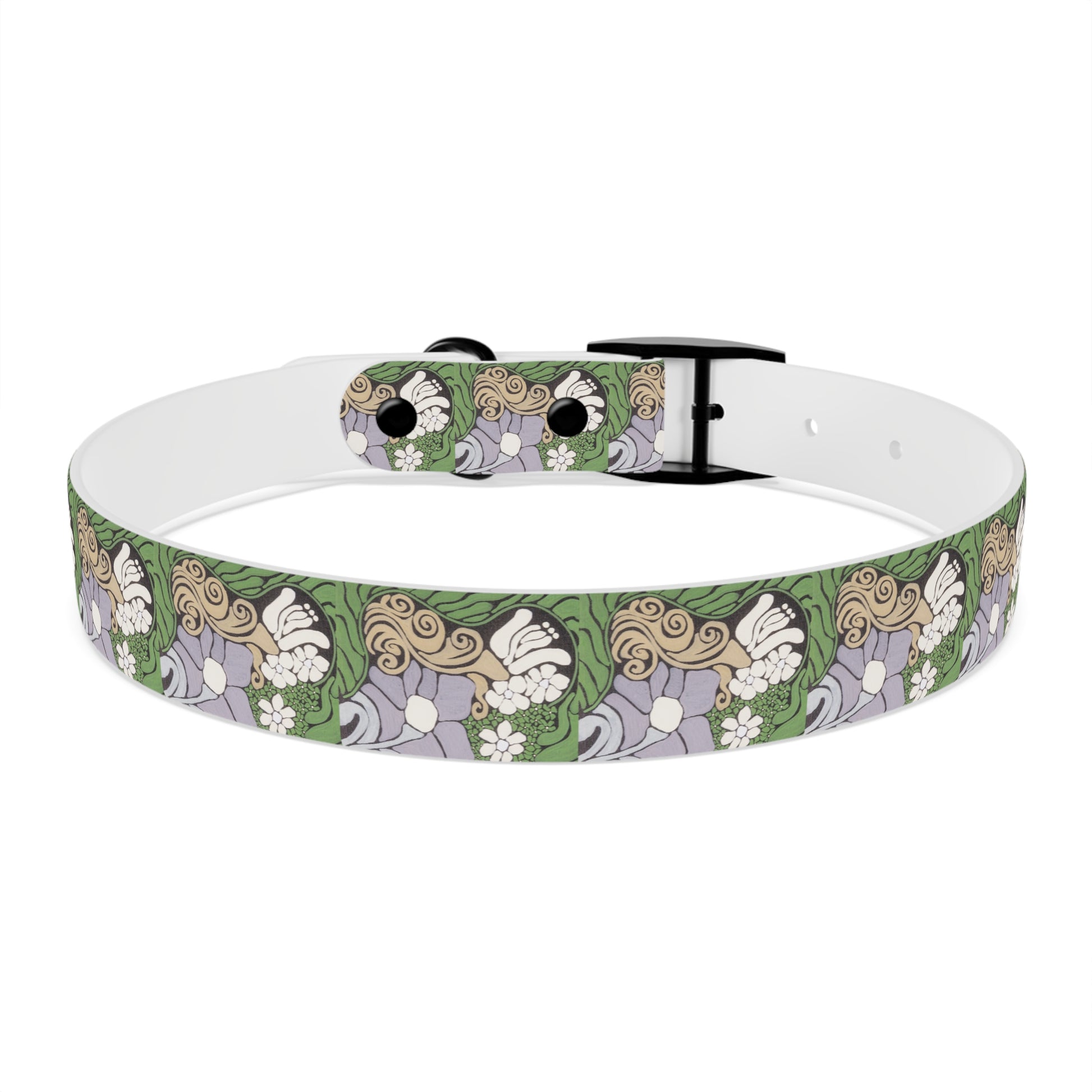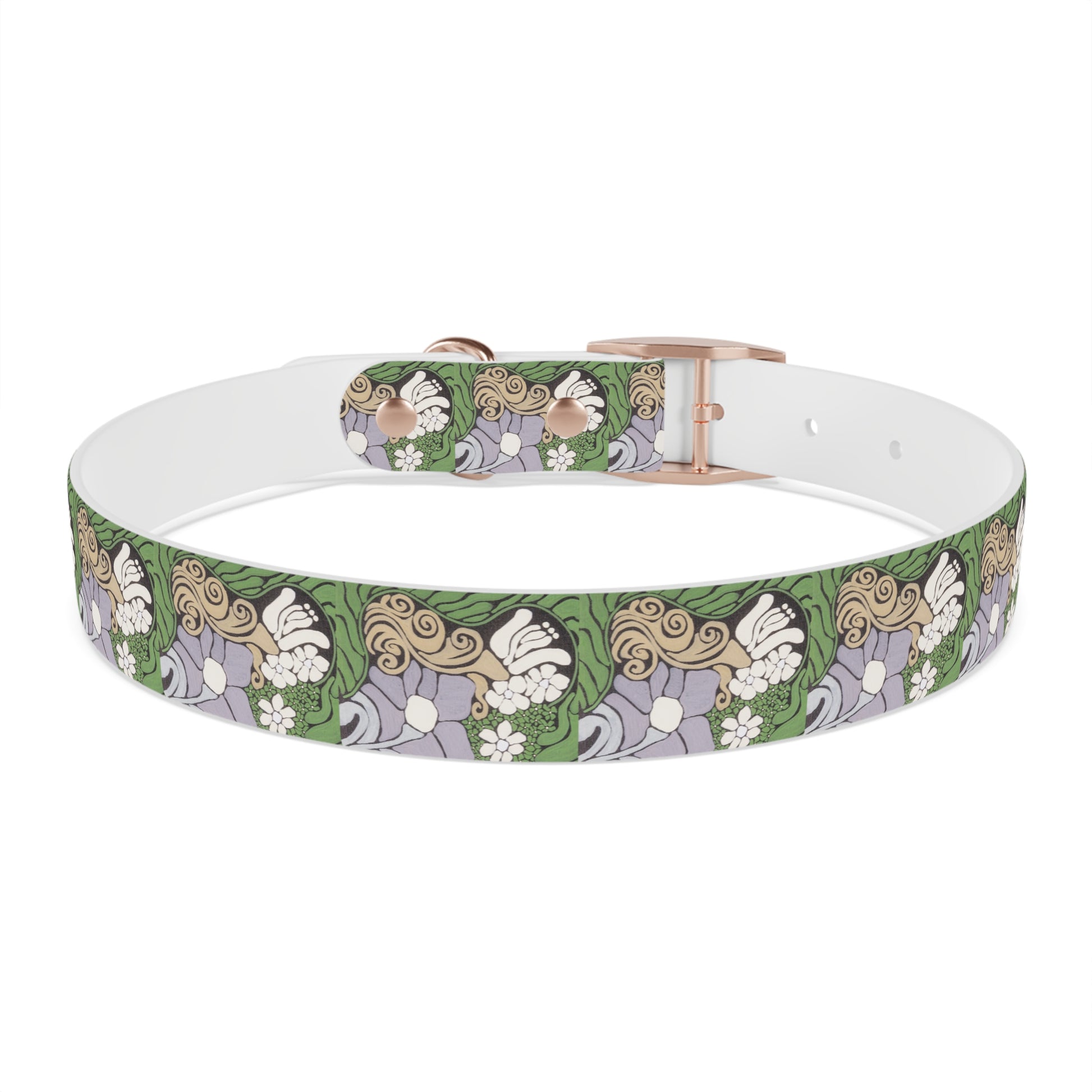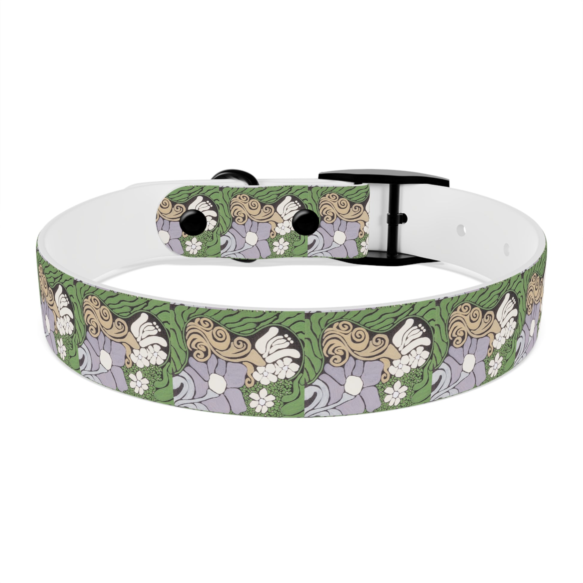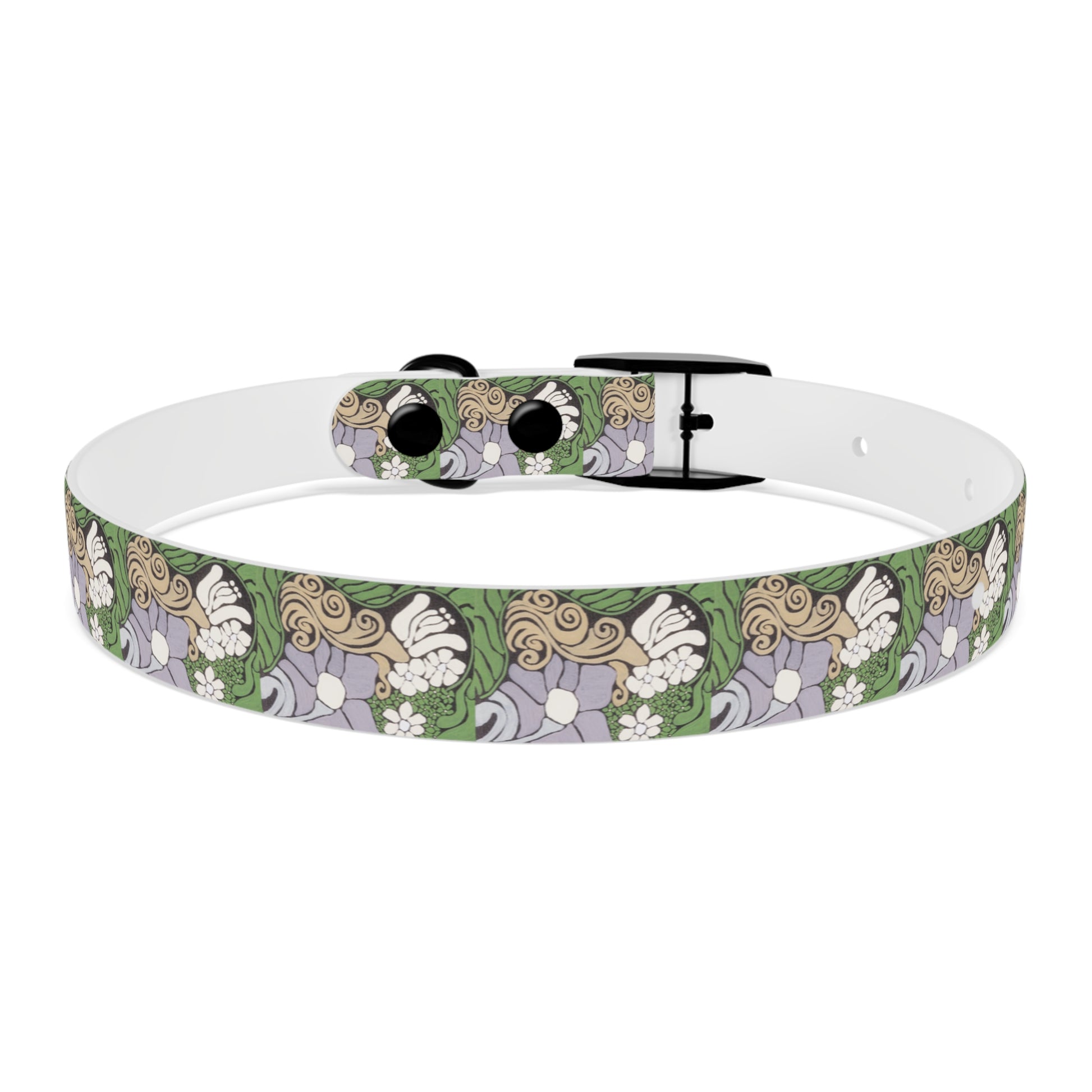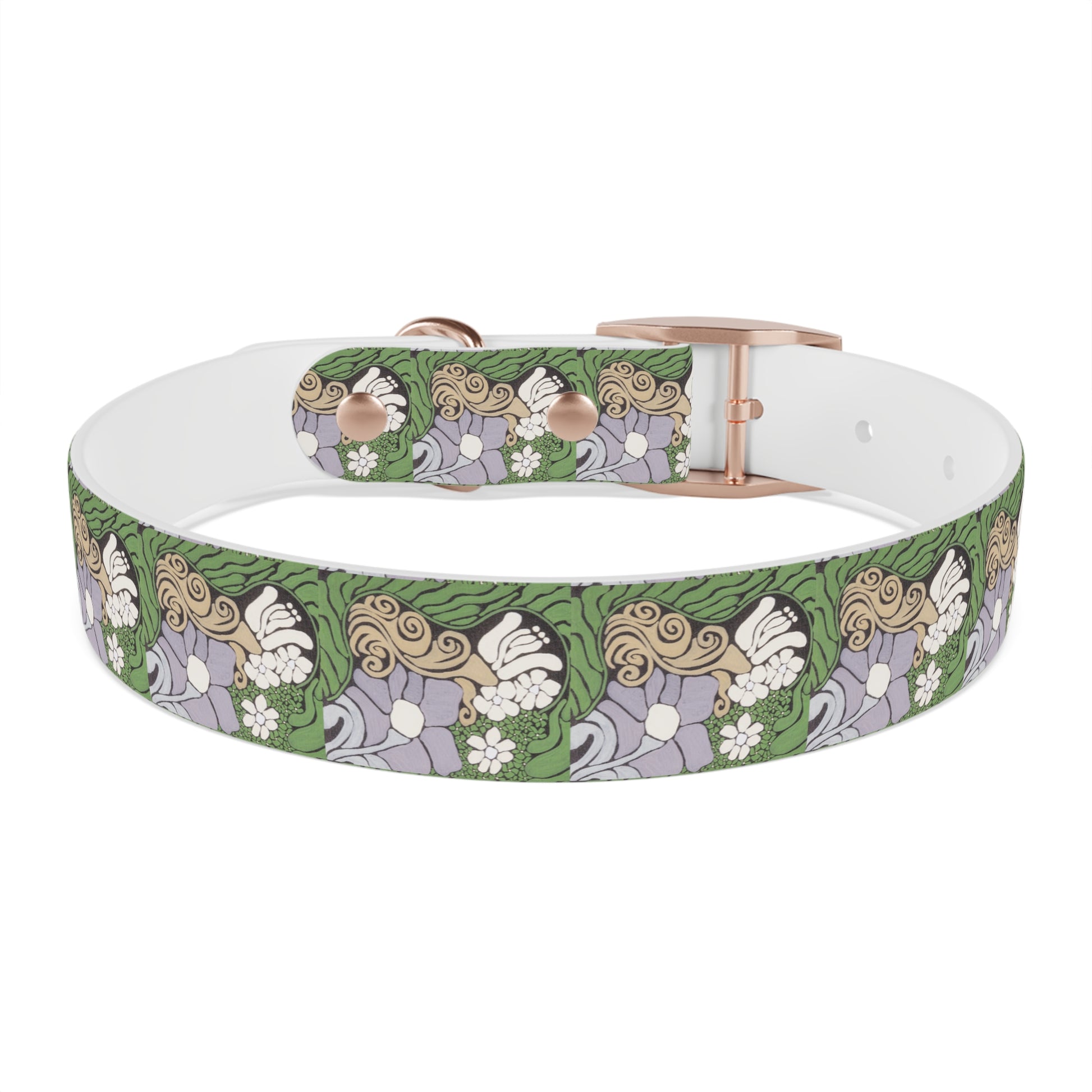 A waterproof, odor-resistant dog collar patterned with soft botanical swirls in muted greens, grey and cream. The TPU construction gives it a smooth, slightly glossy finish that stands up to puddles, mud and long playful days without losing shape or color. Choose from four anodized aluminum buckles — black onyx, gun metal, rose gold or vintage brass — to match your dog’s personality. Hypoallergenic and easy to wipe clean, this collar slips on for walks, park romps, grooming days, and quiet porch sunsets with equal comfort and durability.
