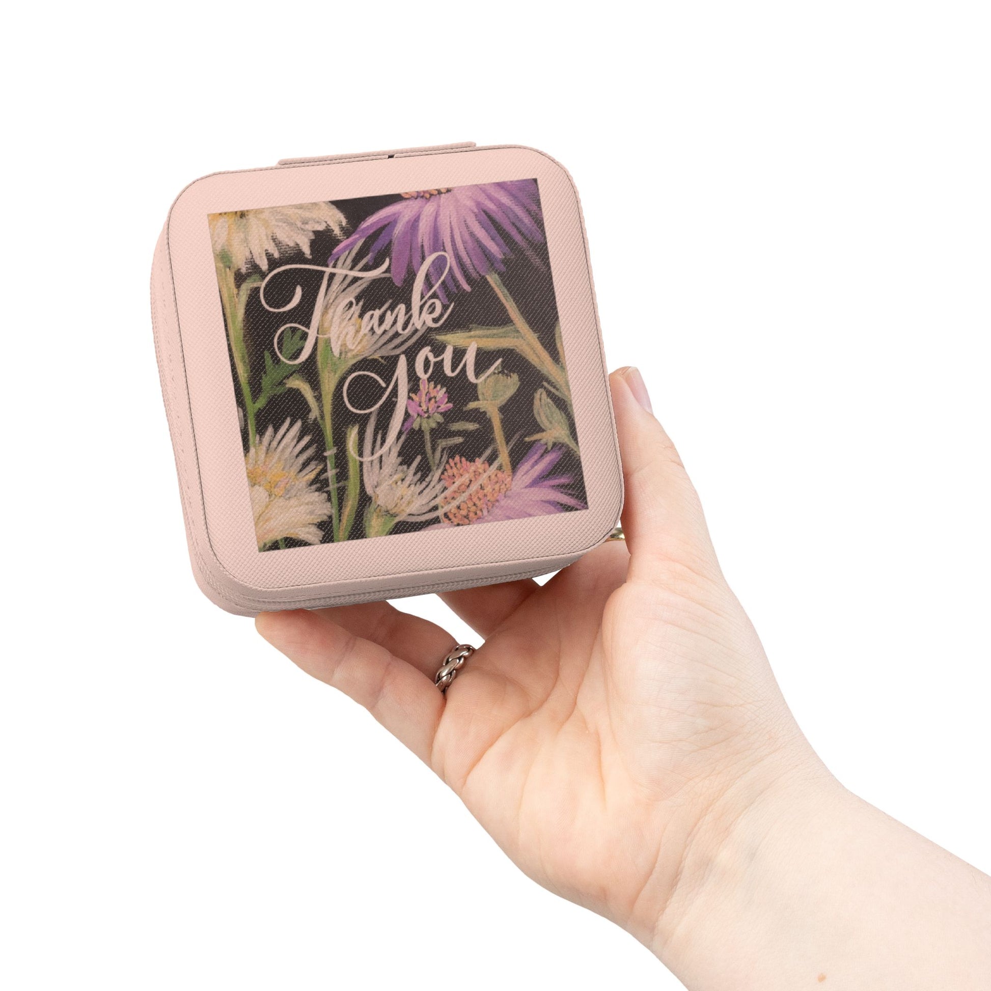 Thank you Travel Jewelry Case – Compact Pink Organizer with 'Thank You' Floral Lid