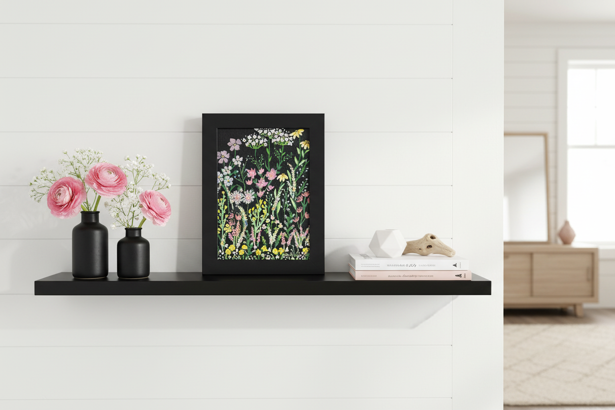 Tiny Bloom Tangle is a joyful little garden captured in miniature—a lively mix of blossoms twisting and tumbling together in the sweetest, most whimsical way. Painted as a 5x7 acrylic original on black canvas board, each color pops brightly against the dark background, giving the flowers a magical, glowing feel. Framed in sleek black, this petite piece brings a burst of cheerful charm to any shelf, desk, or cozy corner.