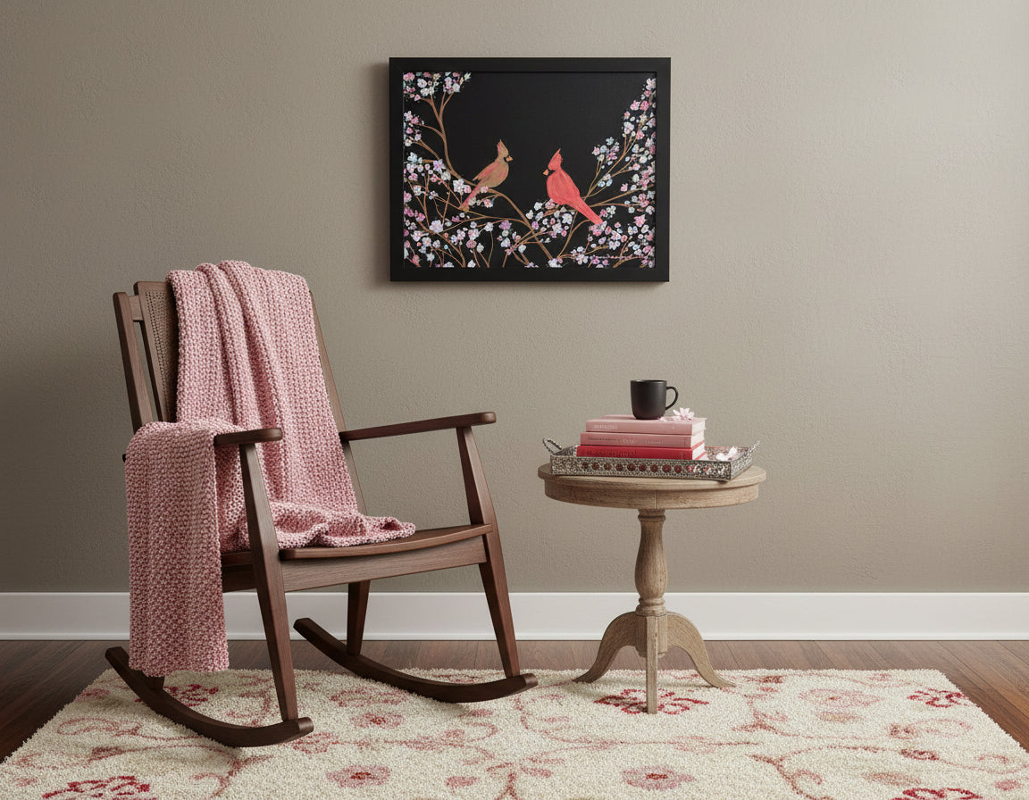 Two cardinals perch in quiet harmony, nestled among delicate blossoms that bloom like whispers against a velvet-black sky. Painted in rich acrylic on canvas board, this 11 x 14” piece captures a moment of stillness and soul connection—two vibrant spirits drawn together by something unseen, yet unbreakable.