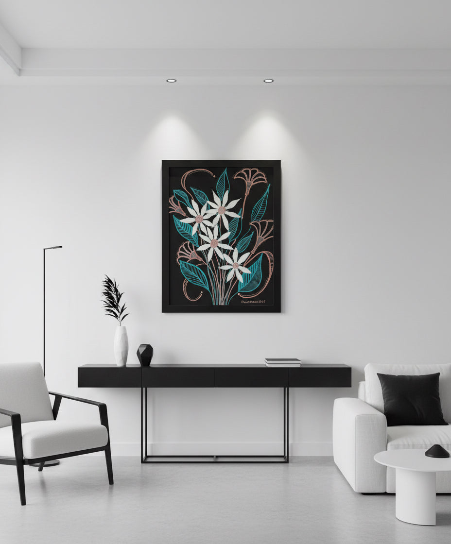 A moonlit hush drapes this garden of dreams, where delicate white blooms sway in soft conversation with teal-kissed leaves. Painted on a rich black canvas board, Whispers and Teal invites you into a world where florals glow like secrets under starlight. Fine-line botanicals and playful bursts of blush create a dance between stillness and story—each petal a whisper, each hue a heartbeat.