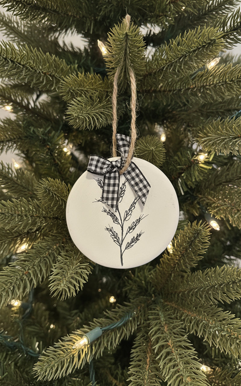 Tied with a black-and-white checkered bow and suspended by rustic twine, it blends minimalist charm with heartfelt warmth. Painted on both sides and signed “SR” with the year 2025, this ornament is a soulful addition to your tree—perfect for gifting, collecting, or celebrating the beauty of nature in winter’s hush.