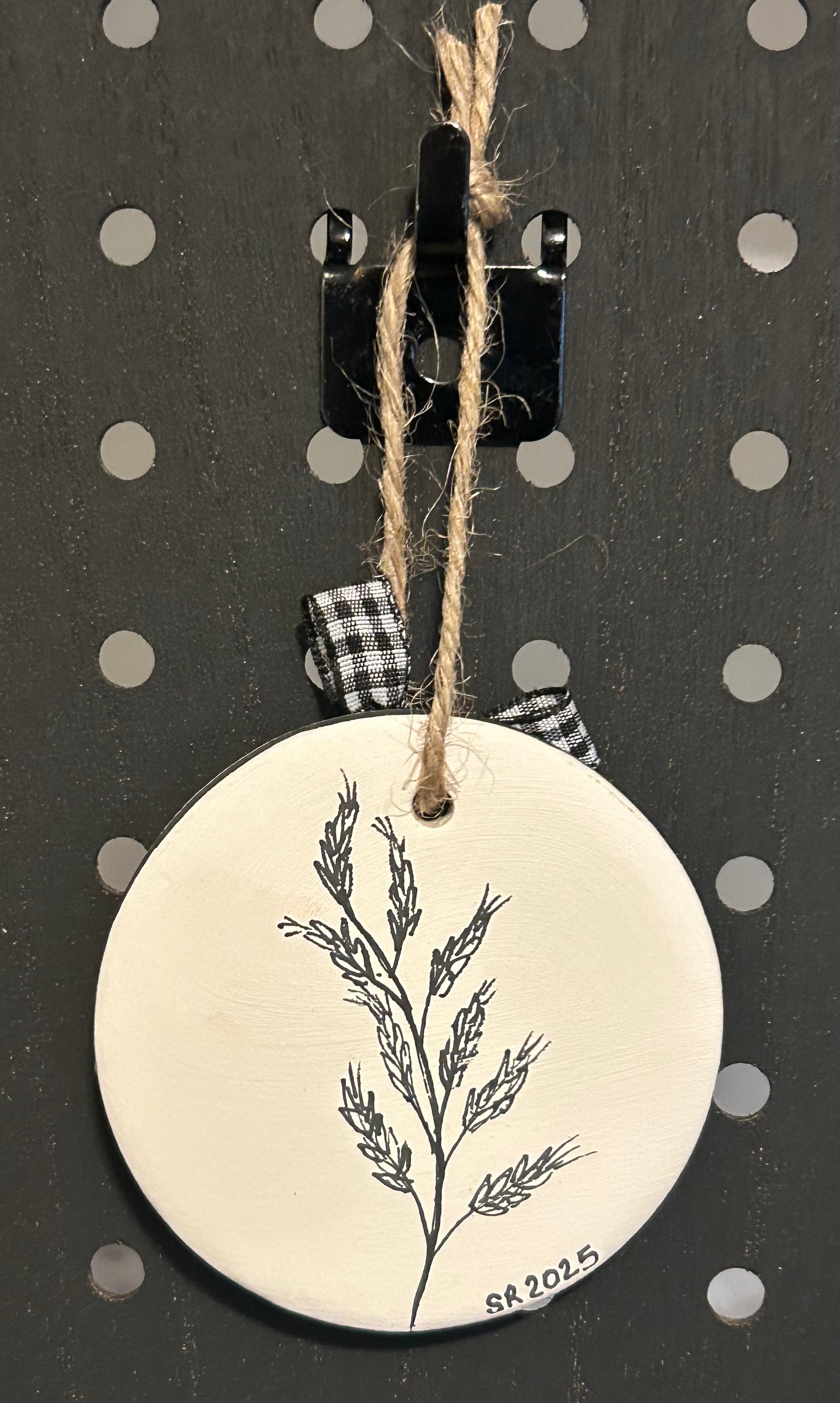 Inspired by the feathery tops of ornamental grasses swaying in the chill of late autumn, Winter Plume captures nature’s quiet elegance in a holiday keepsake. This 2.9” x 2.9” ceramic ornament features a hand-painted botanical silhouette in deep black ink, set against a soft cream background. Its delicate lines evoke the serenity of winter fields and the gentle rhythm of seasonal change.