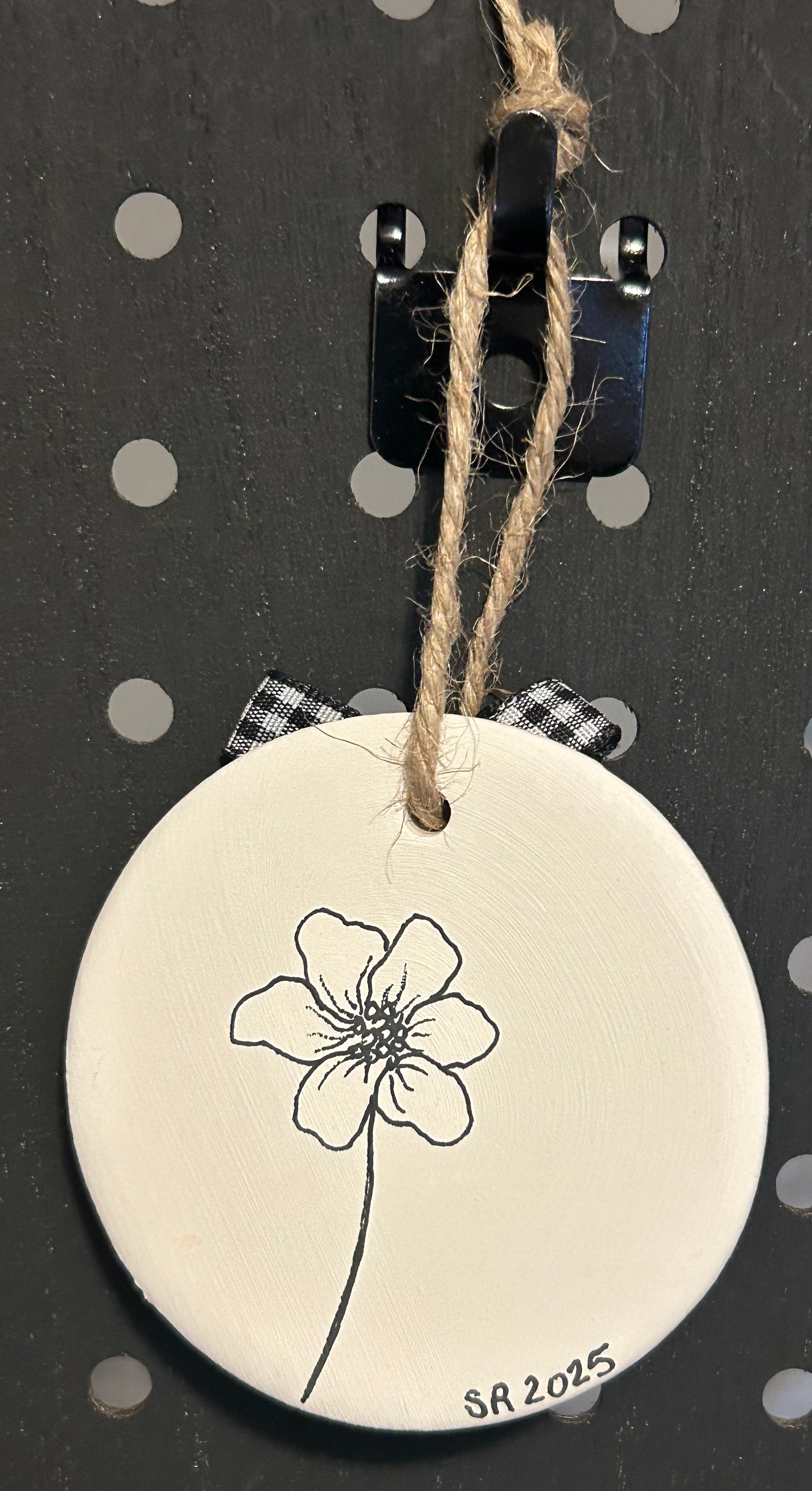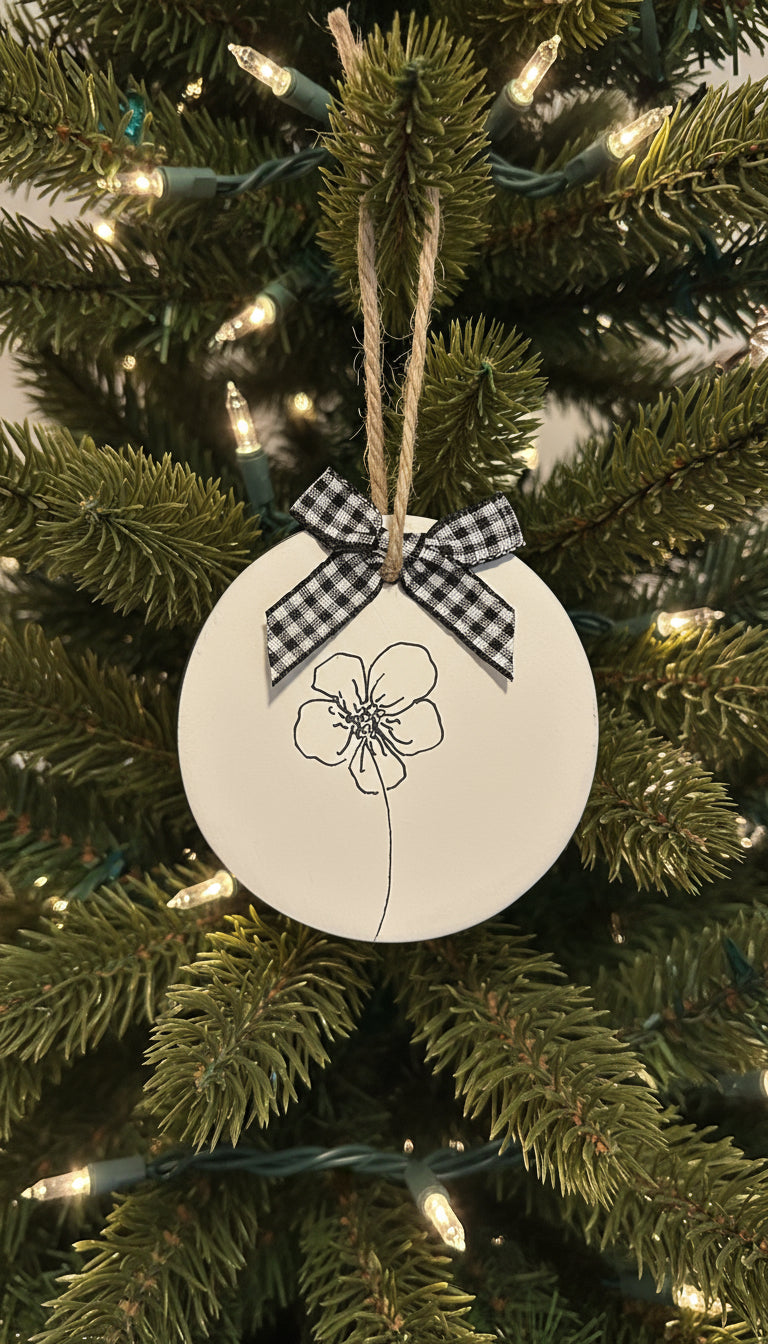 Let your holiday decor whisper warmth with Winter’s Hush, a delicate ornament that captures the quiet beauty of the season. Featuring a hand-drawn five-petal bloom in fine black lines on a soft cream background, this piece evokes simplicity and grace. A black-and-white checkered bow adds a playful touch, while rustic twine completes the handmade charm.
